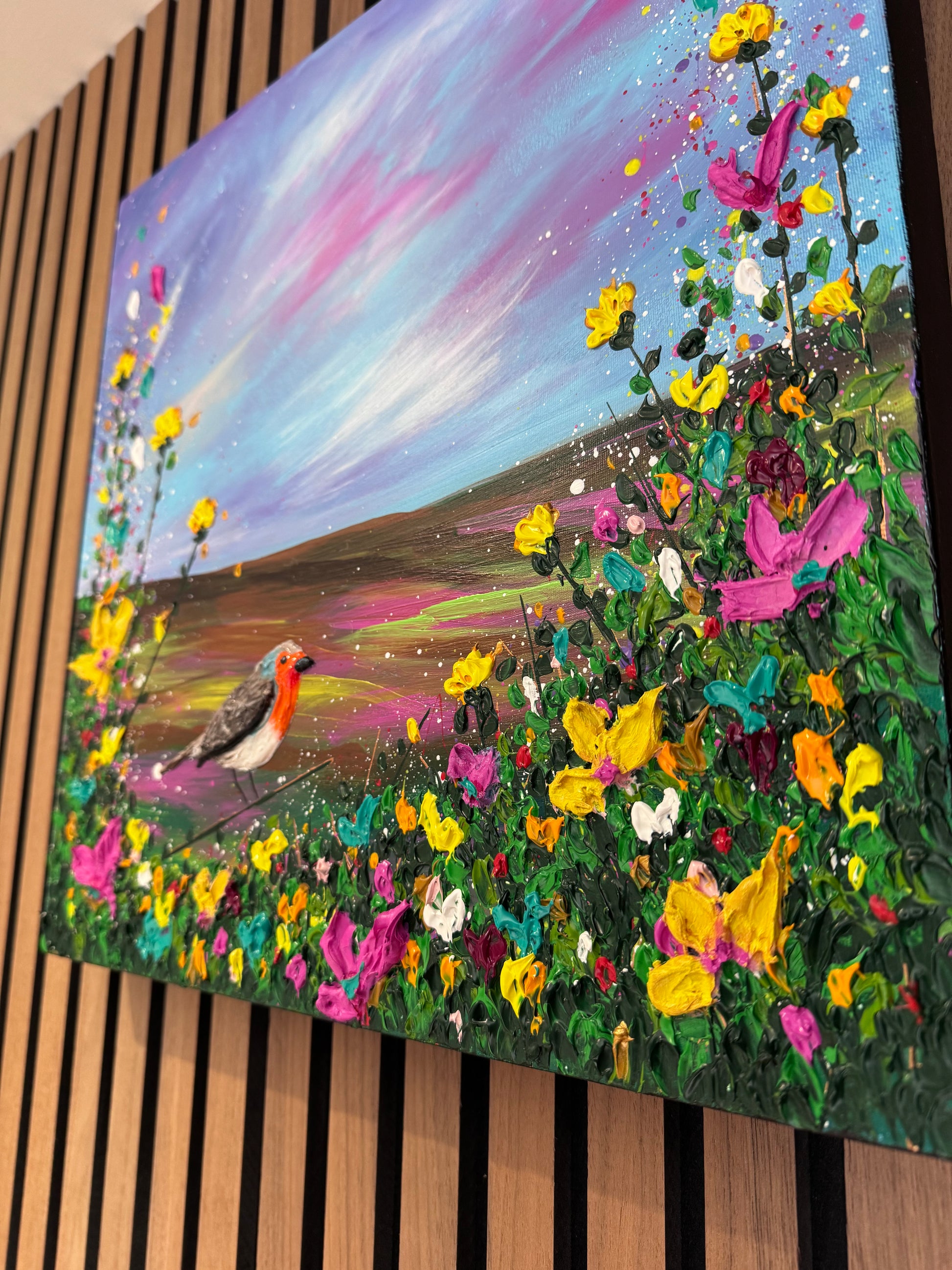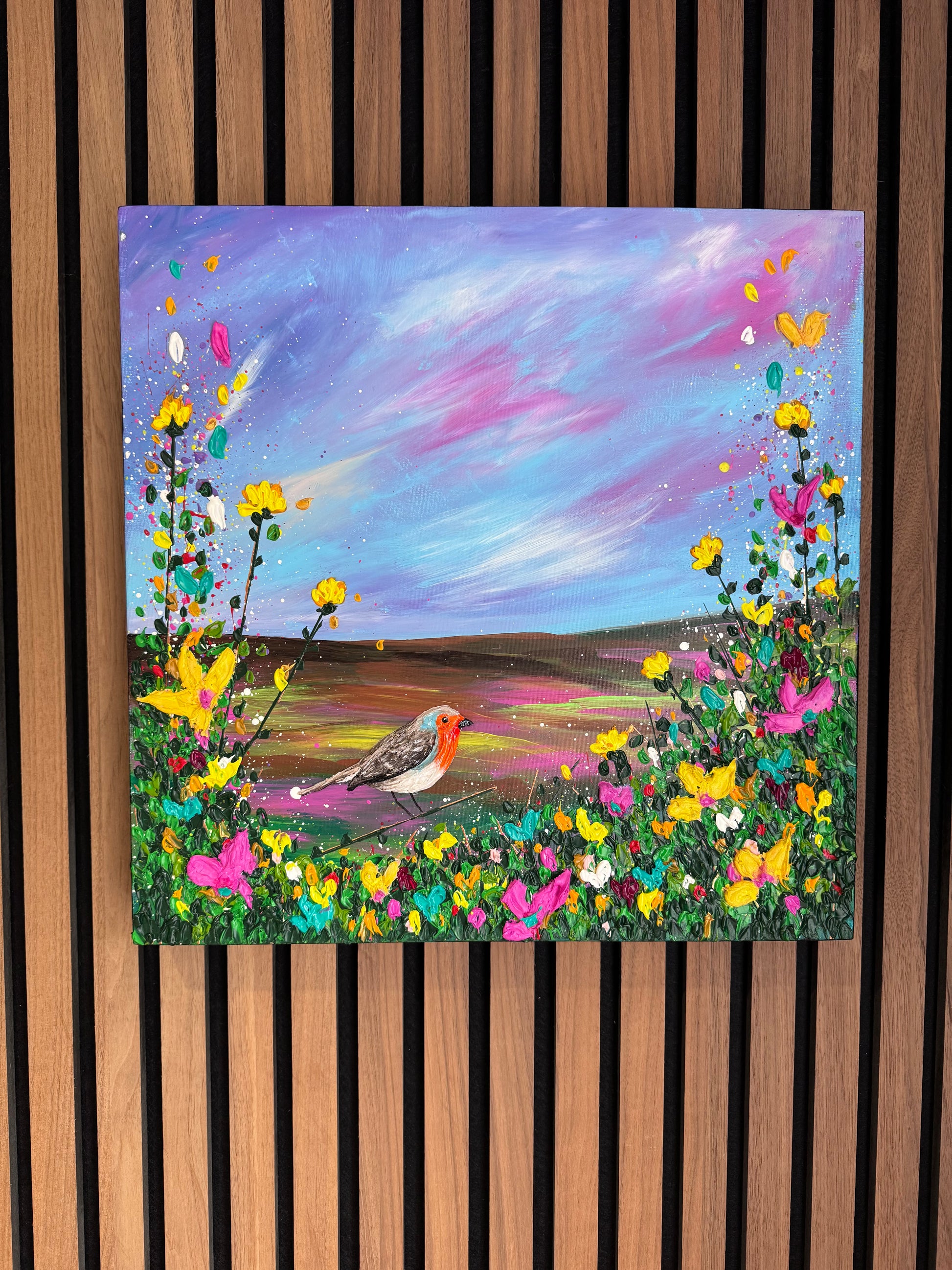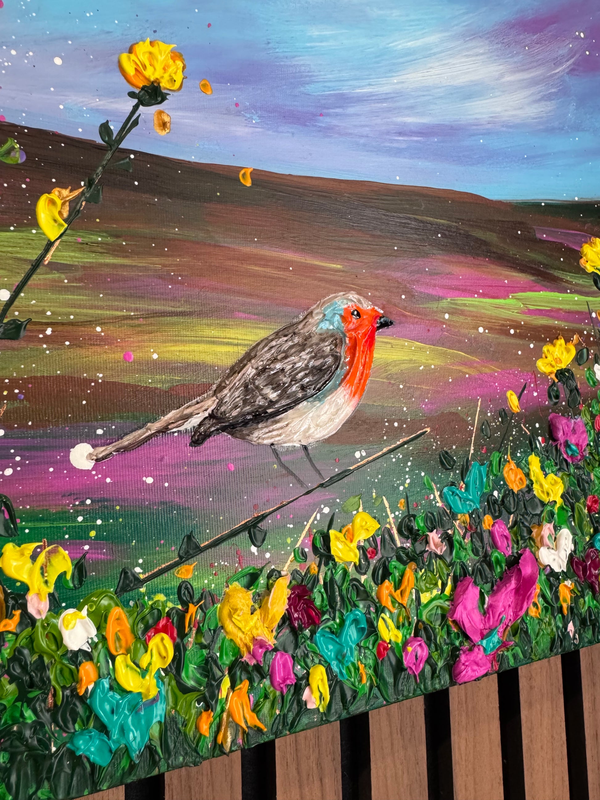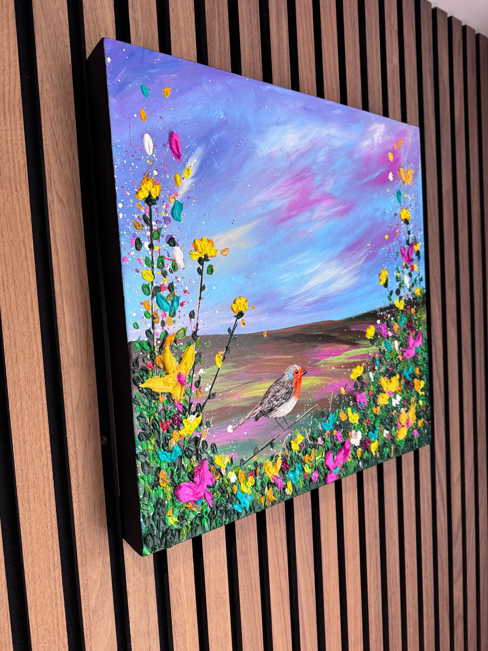“A Cherished Moment” carries a deeper emotional intensity, with a richer, more vibrant sky that evokes memory, warmth, and enduring connection. The robin sits quietly within a burst of textured florals — grounded, present, and symbolic.