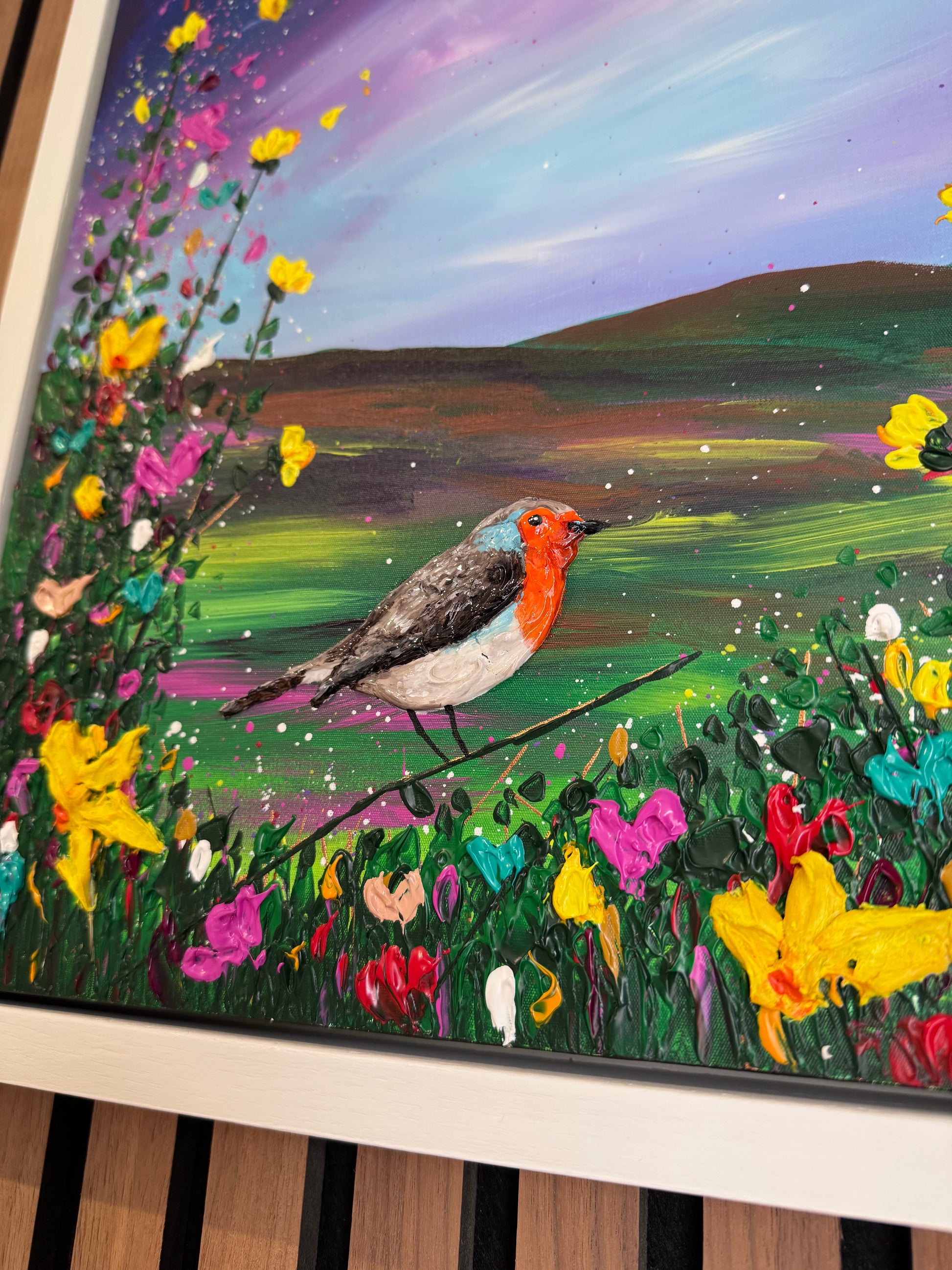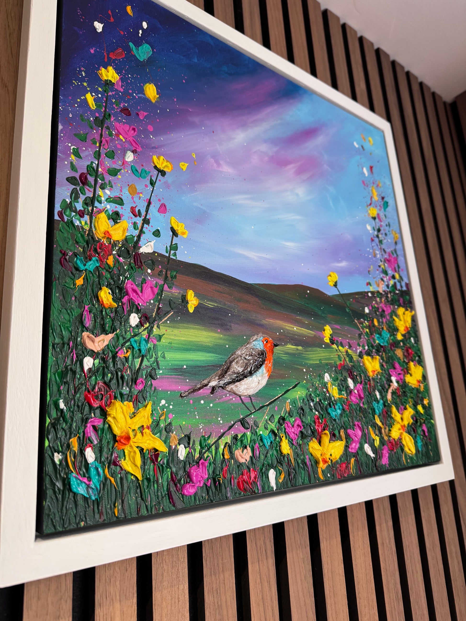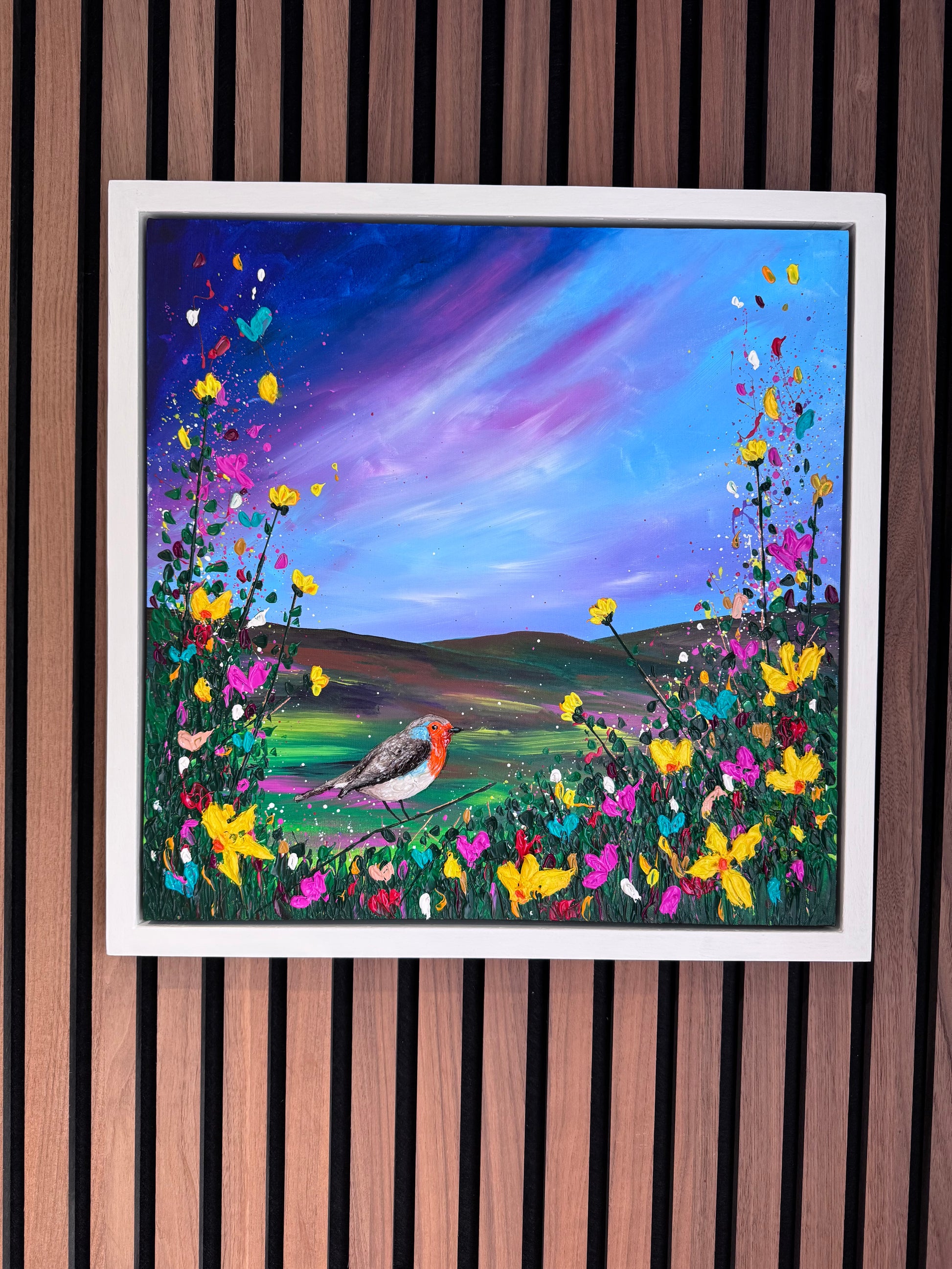 “A Moment With You” carries a deeper emotional intensity, with a richer, more vibrant sky that evokes memory, warmth, and enduring connection. The robin sits quietly within a burst of textured florals — grounded, present, and symbolic.