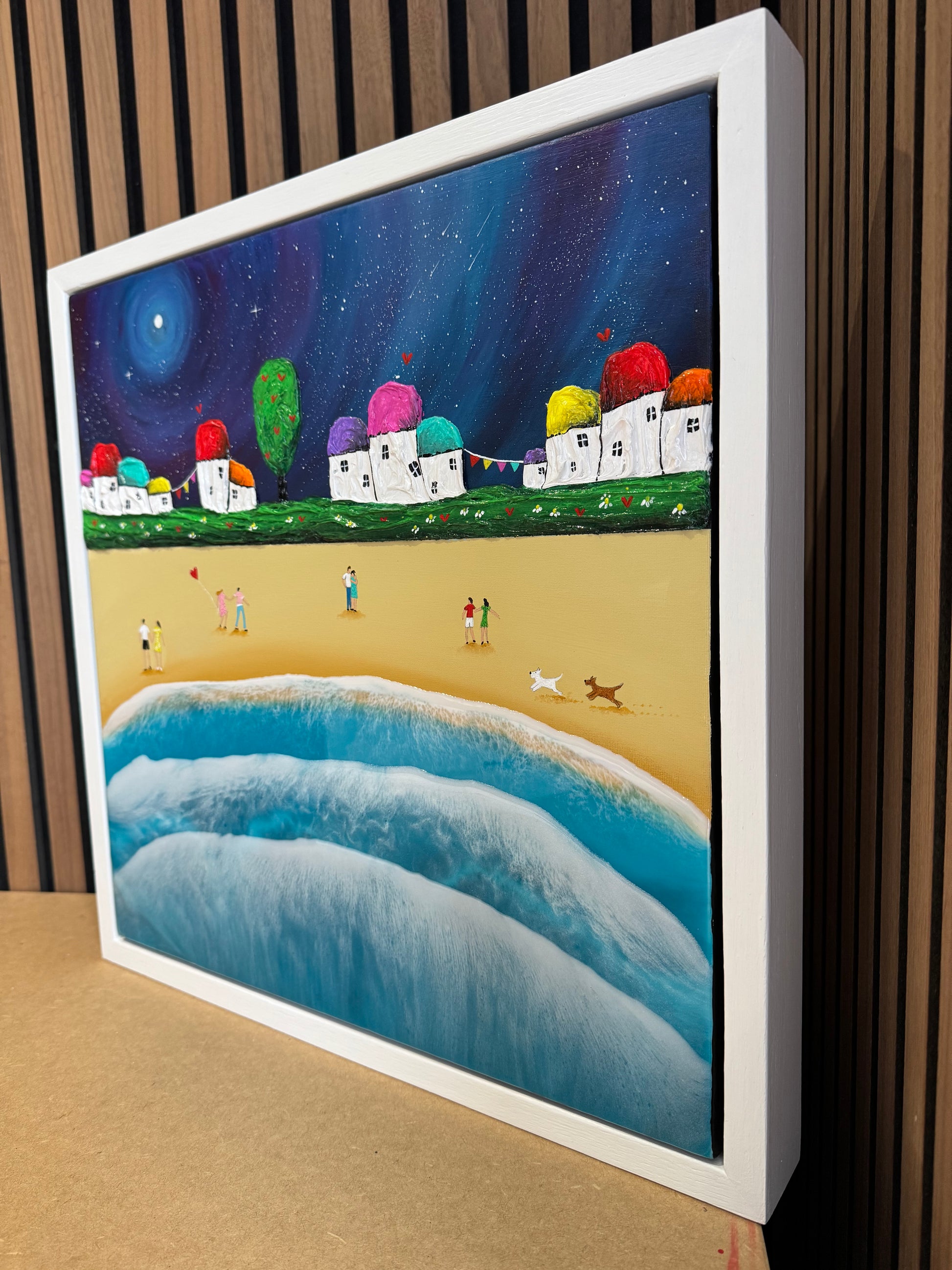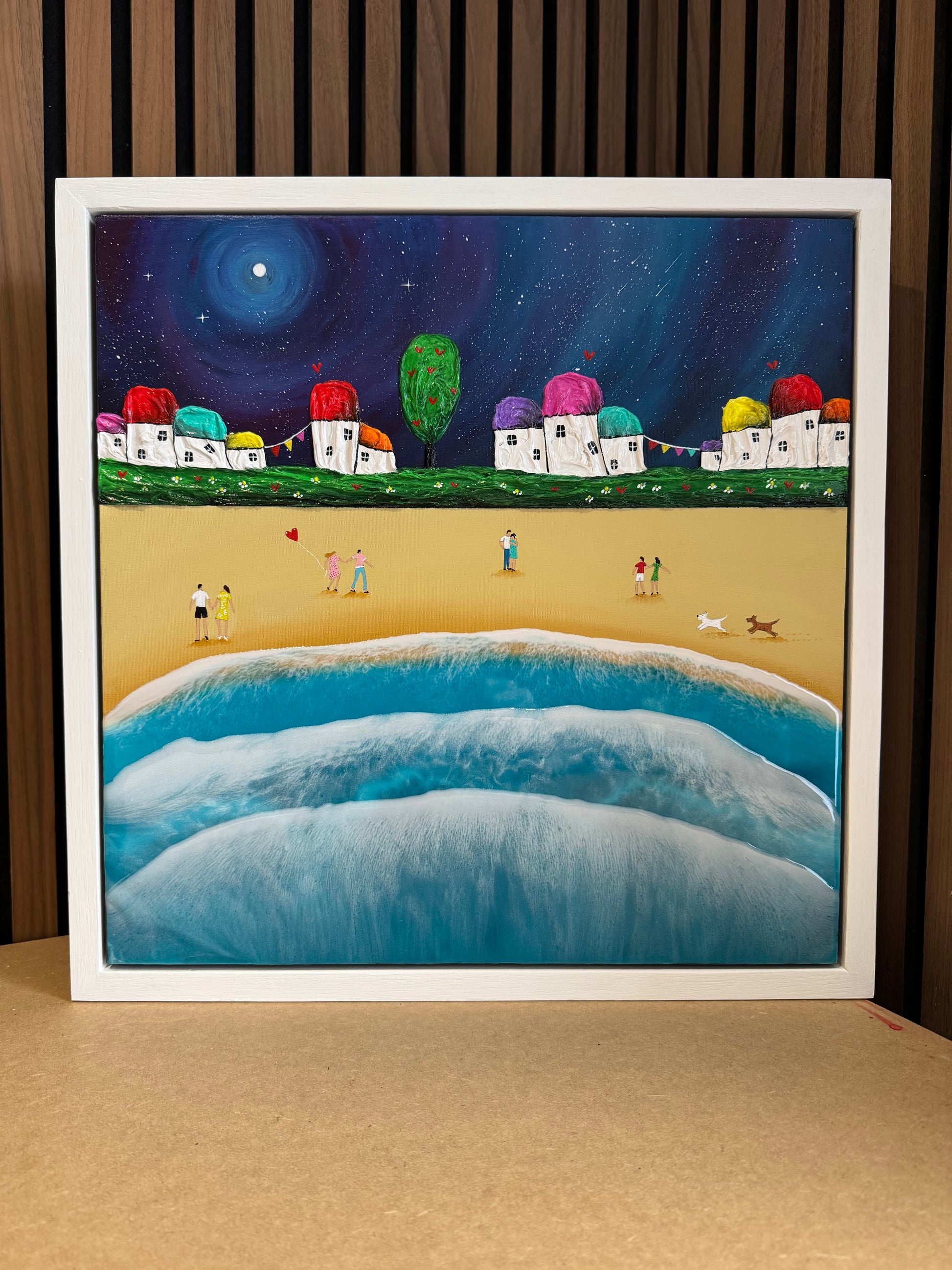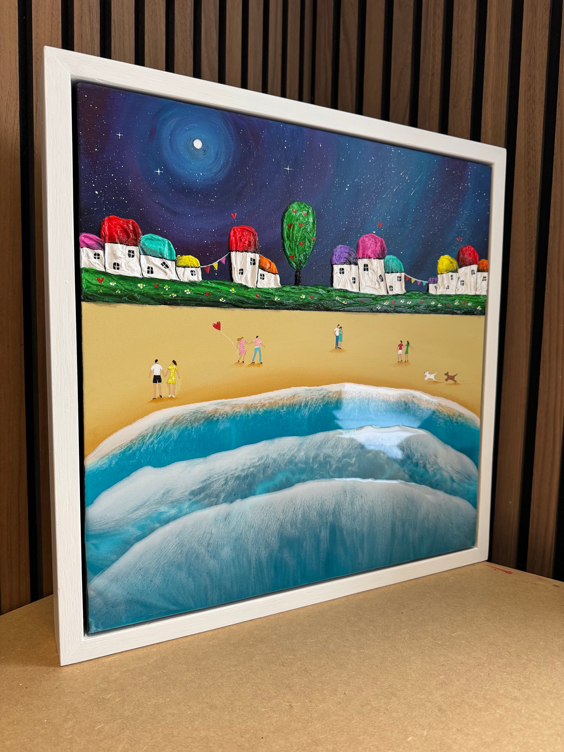 As a 3D artist with over a decade of experience working with resin, I have encountered numerous resin wave creations. However, I did not want to merely represent my surroundings and cherished childhood memories of beach holidays through waves alone. I recognized that the sea had to be a significant aspect of my work, but I also sought to incorporate beach life and the charm of quirky coastal towns. The rugged hills, unique cottages, lighthouses, and even camper vans are all hand-sculpted directly onto the canvas, rendering each painting completely unique. They even cast their own shadows, enhancing their lifelike quality in a manner that sets them apart from others.