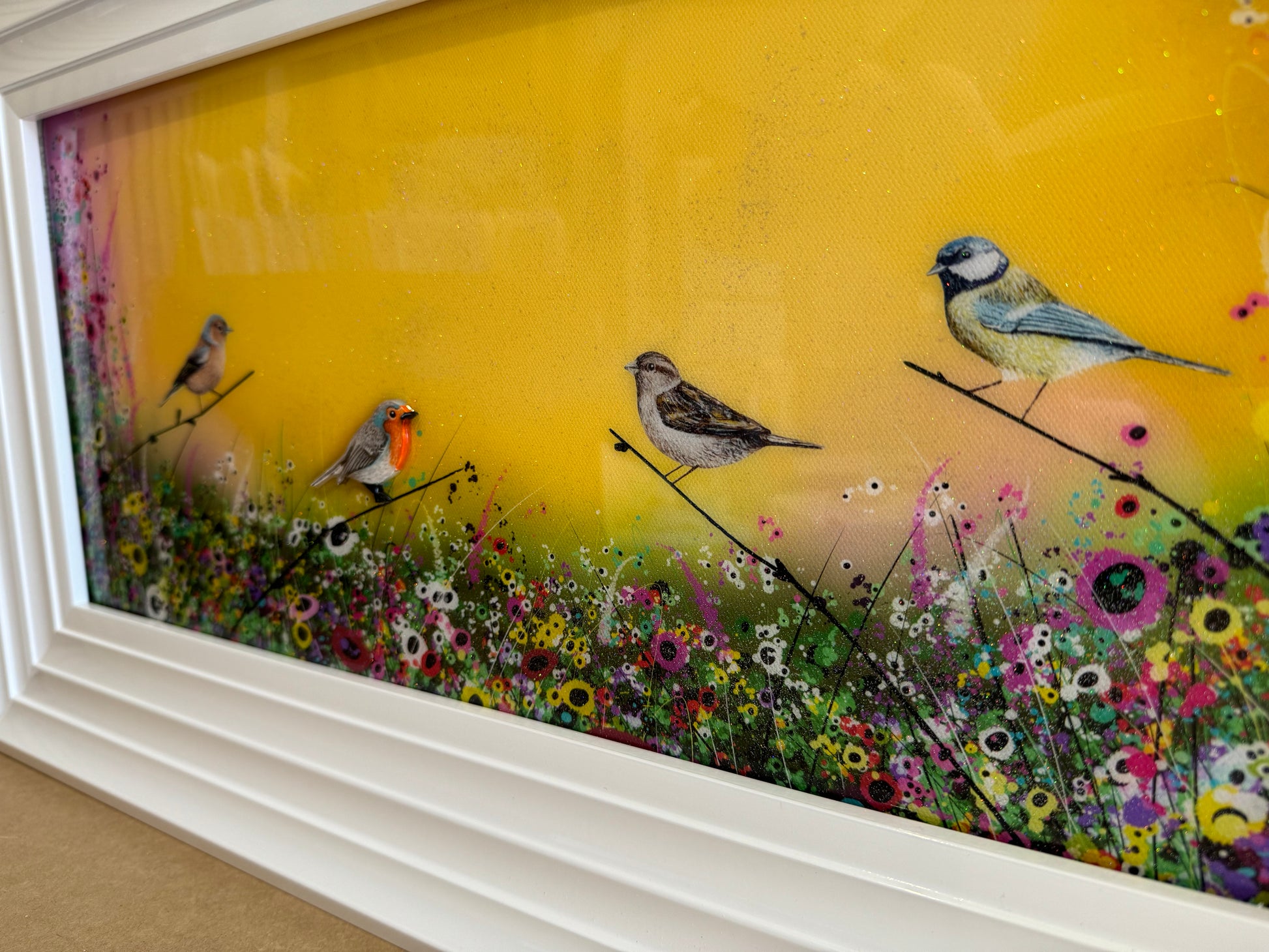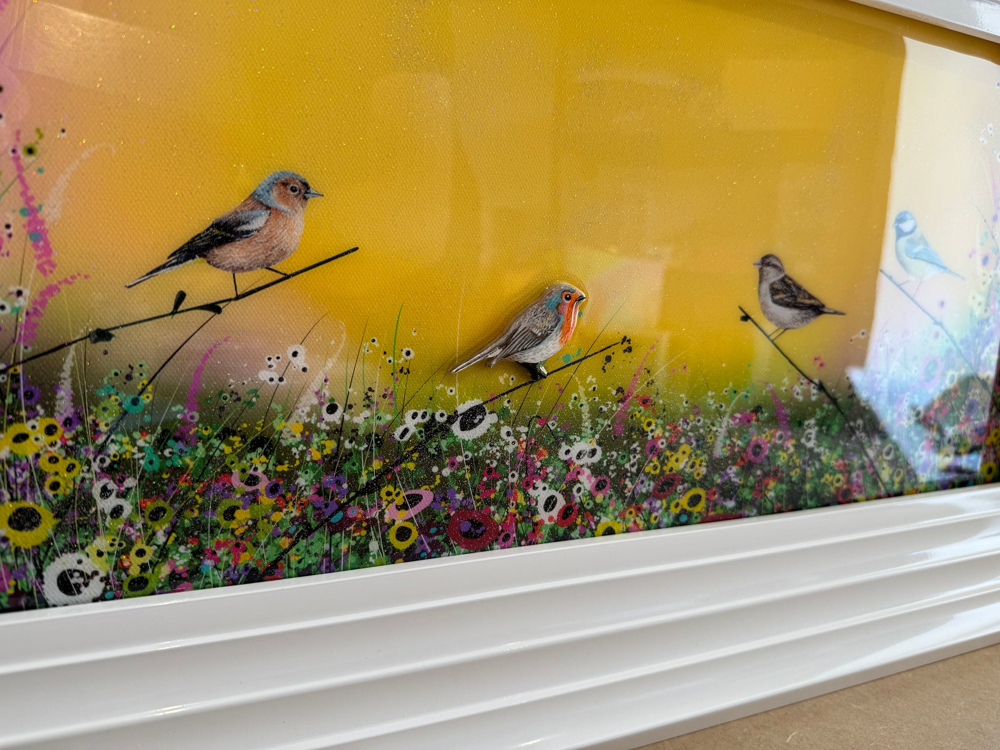 resin mixed media on board with 3D hand painted and cut Robin element. Complete with diamond dust for unbelievable sparkle when light hits the image.