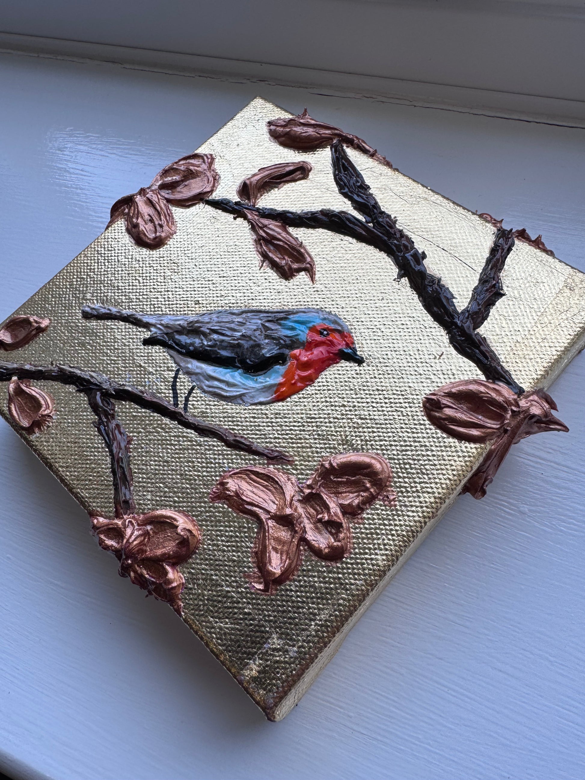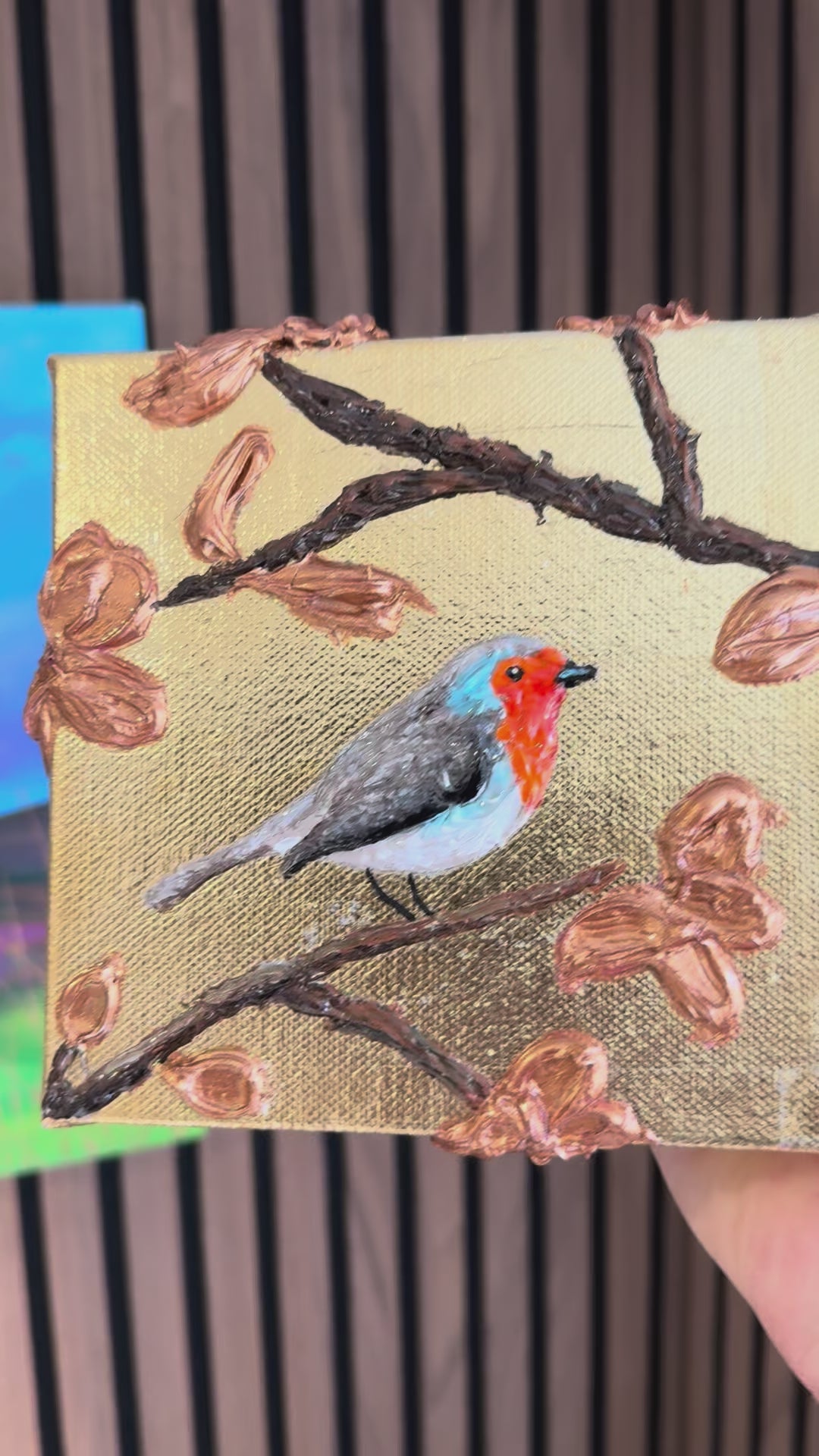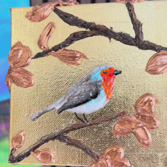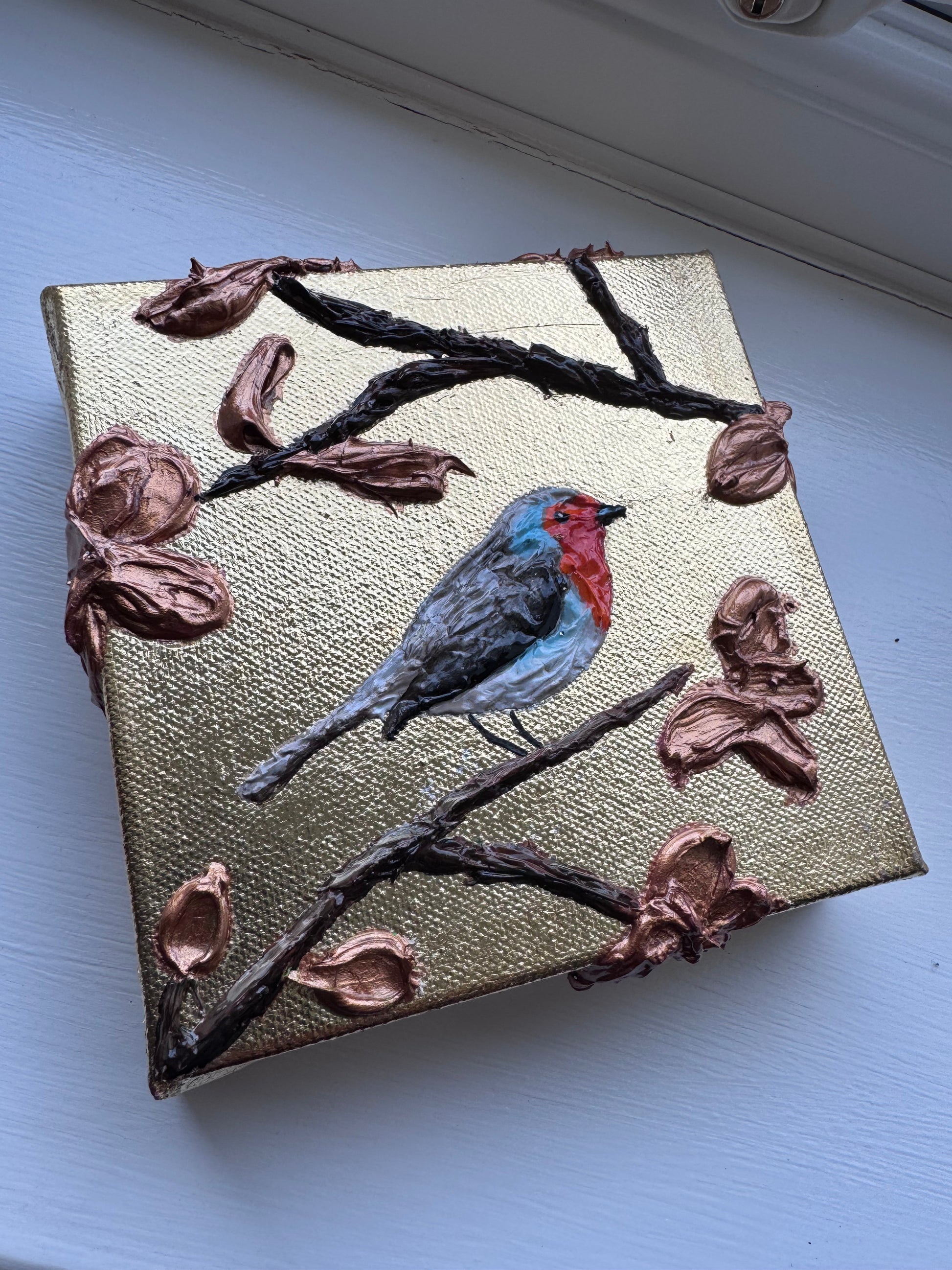 Each small box canvas is a one-of-a-kind, hand-painted piece, centred around a single robin — a gentle presence, full of meaning.