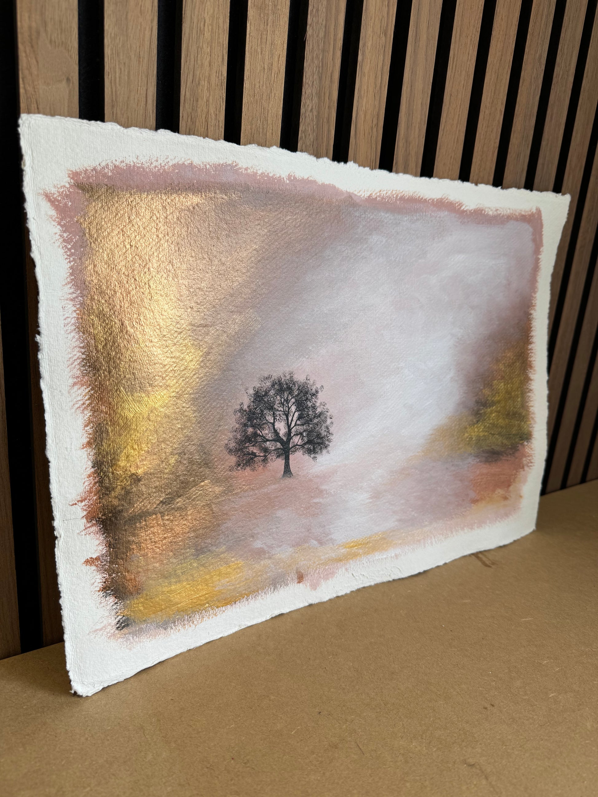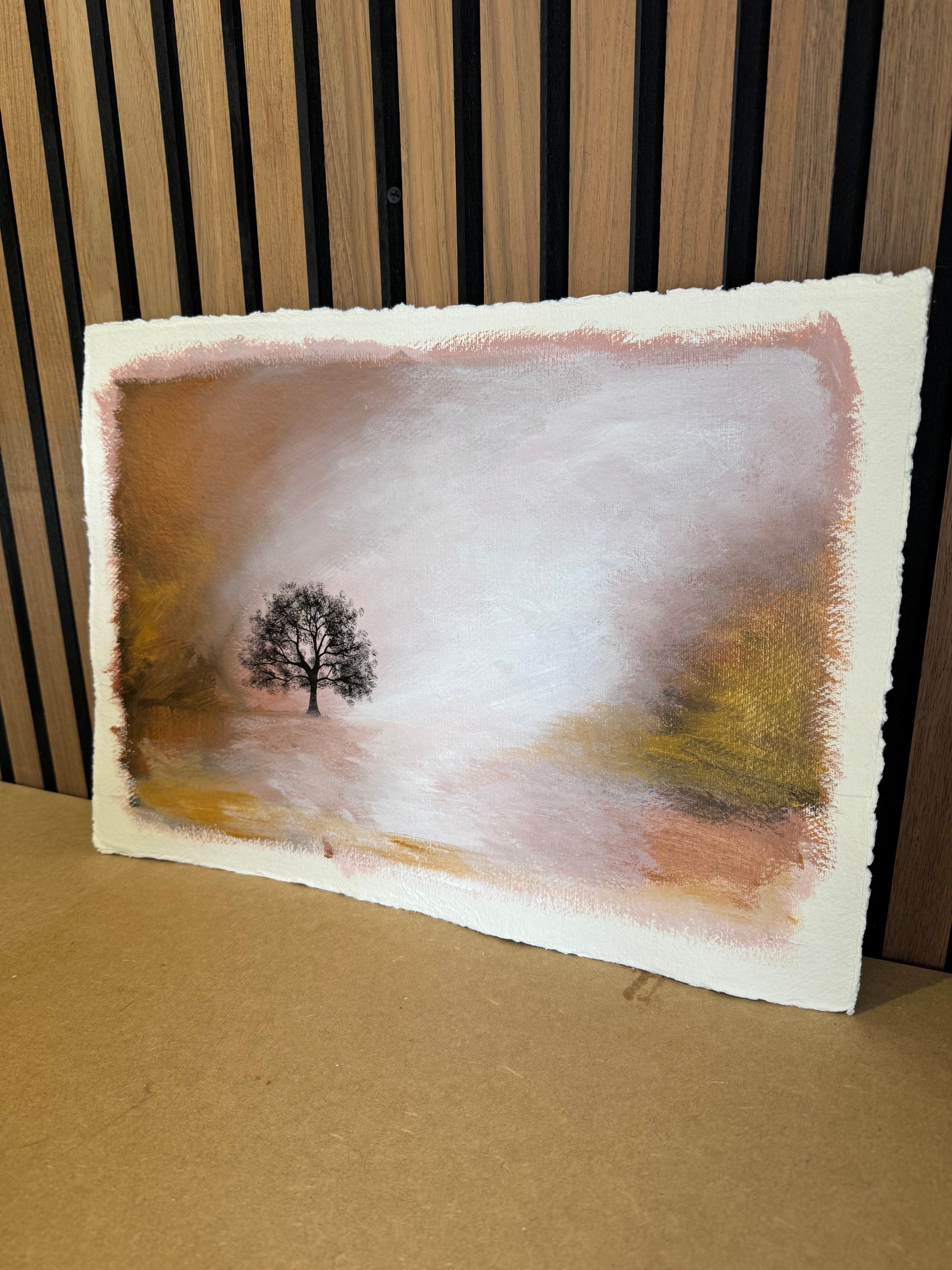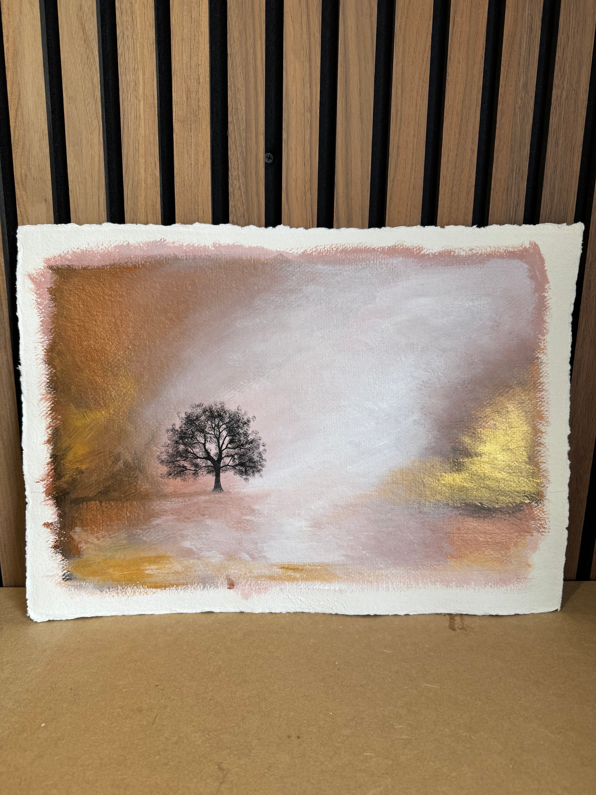 This original mixed media artwork combines a rich palette of acrylics and inks applied on 640gsm handmade paper. This piece serves as a contemplative study of stillness and solitude in nature, exploring the profound impact of light and its interaction with the surrounding space. It invites viewers to engage their imaginations, creating a serene atmosphere that encourages introspection and reflection on the tranquility found within the natural world.