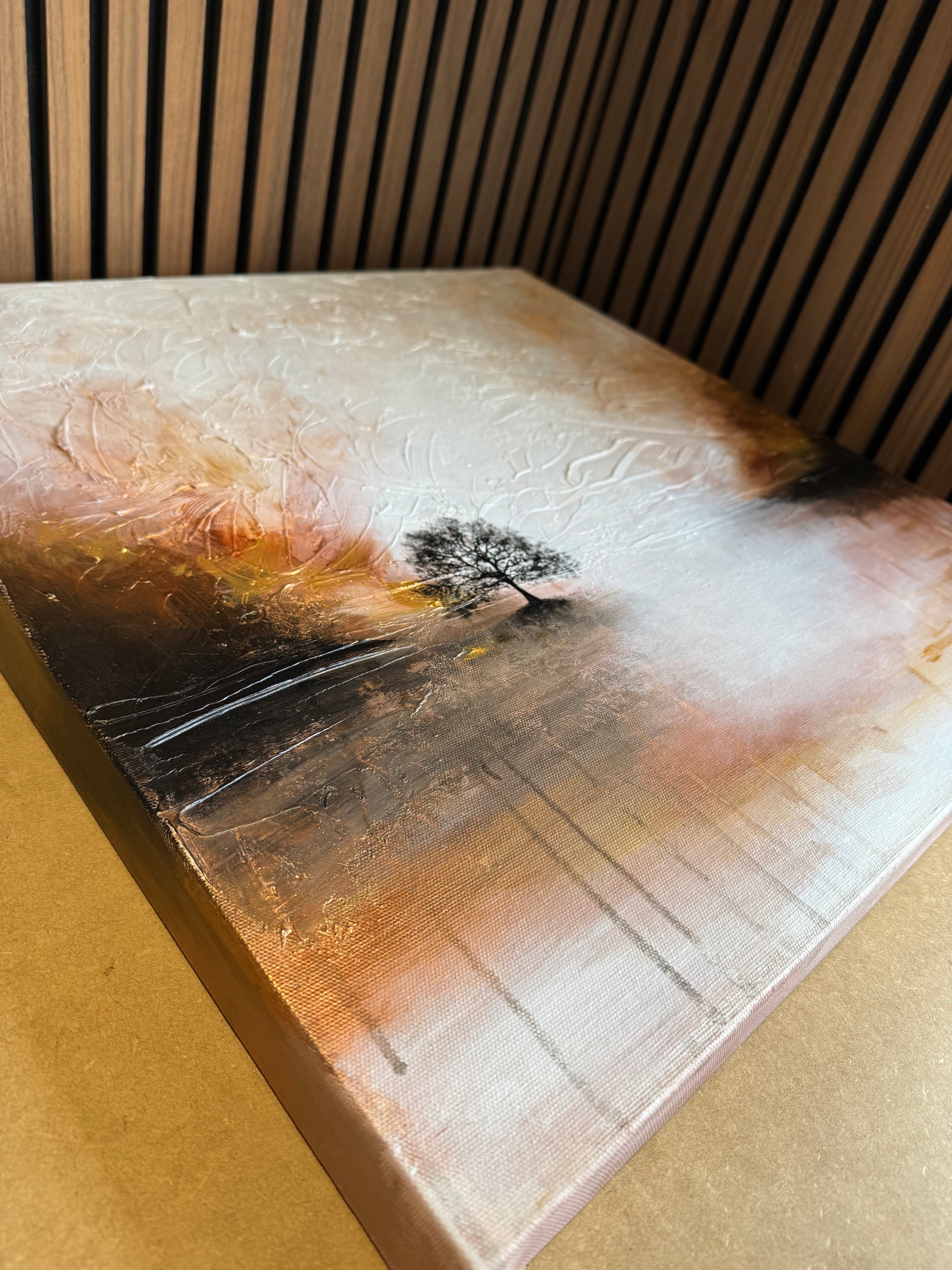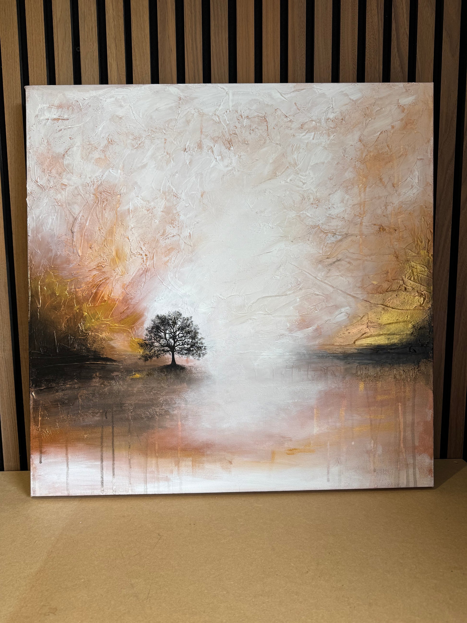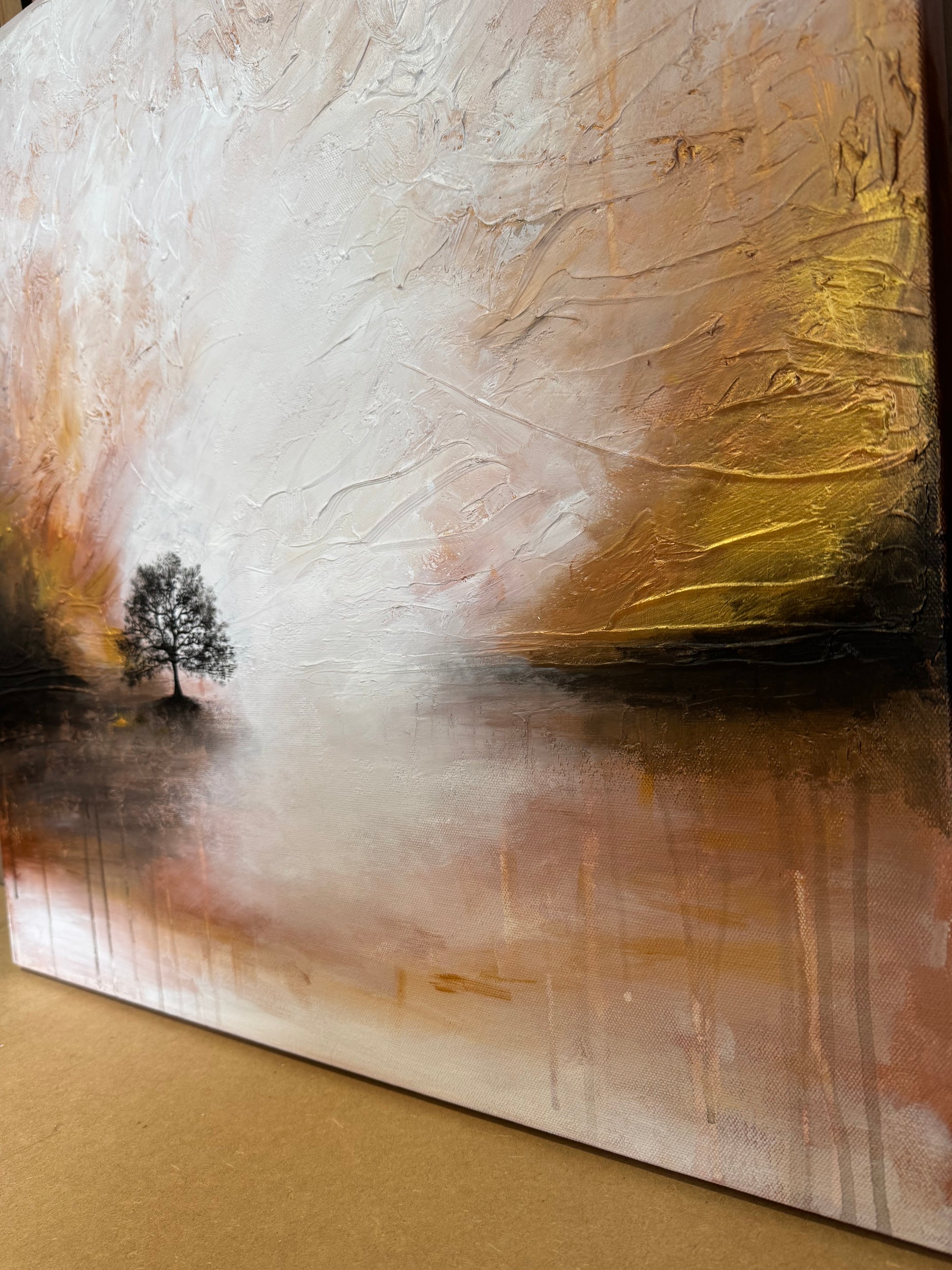 This piece serves as a contemplative study of stillness and solitude in nature, exploring the profound impact of light and its interaction with the surrounding space. It invites viewers to engage their imaginations, creating a serene atmosphere that encourages introspection and reflection on the tranquility found within the natural world.