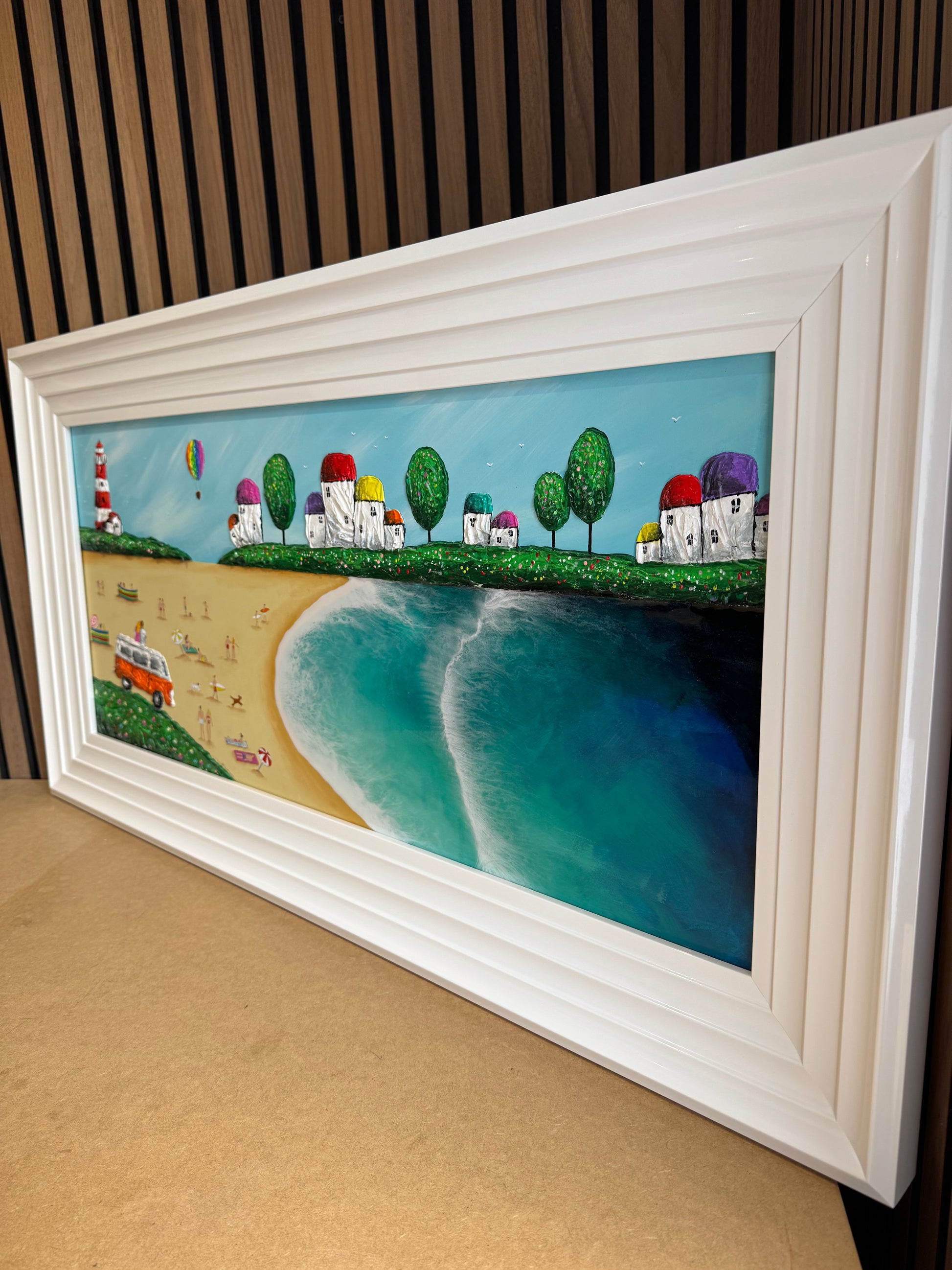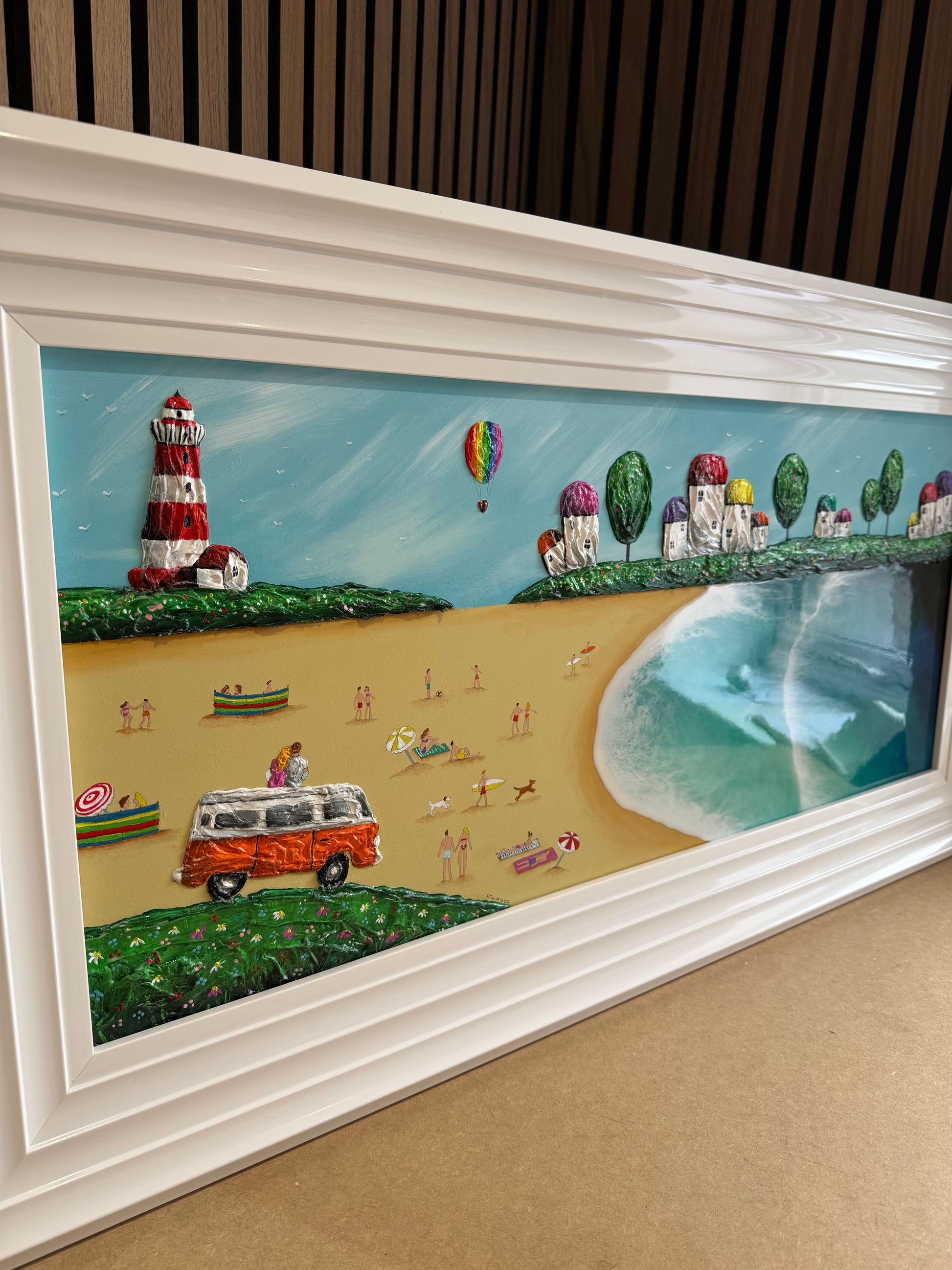 As a 3D artist with over a decade of experience working with resin, I have encountered numerous resin wave creations. However, I did not want to merely represent my surroundings and cherished childhood memories of beach holidays through waves alone. I recognized that the sea had to be a significant aspect of my work, but I also sought to incorporate beach life and the charm of quirky coastal towns. The rugged hills, unique cottages, lighthouses, and even camper vans are all hand-sculpted directly onto the canvas, rendering each painting completely unique. They even cast their own shadows, enhancing their lifelike quality in a manner that sets them apart from others.