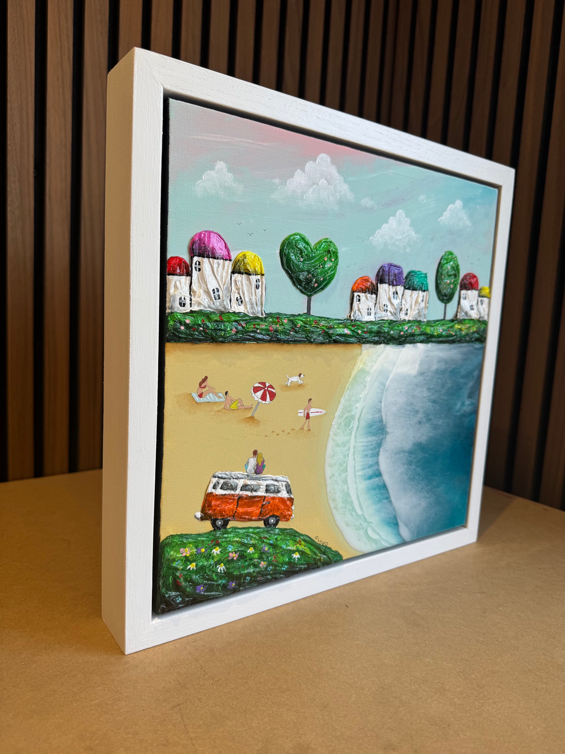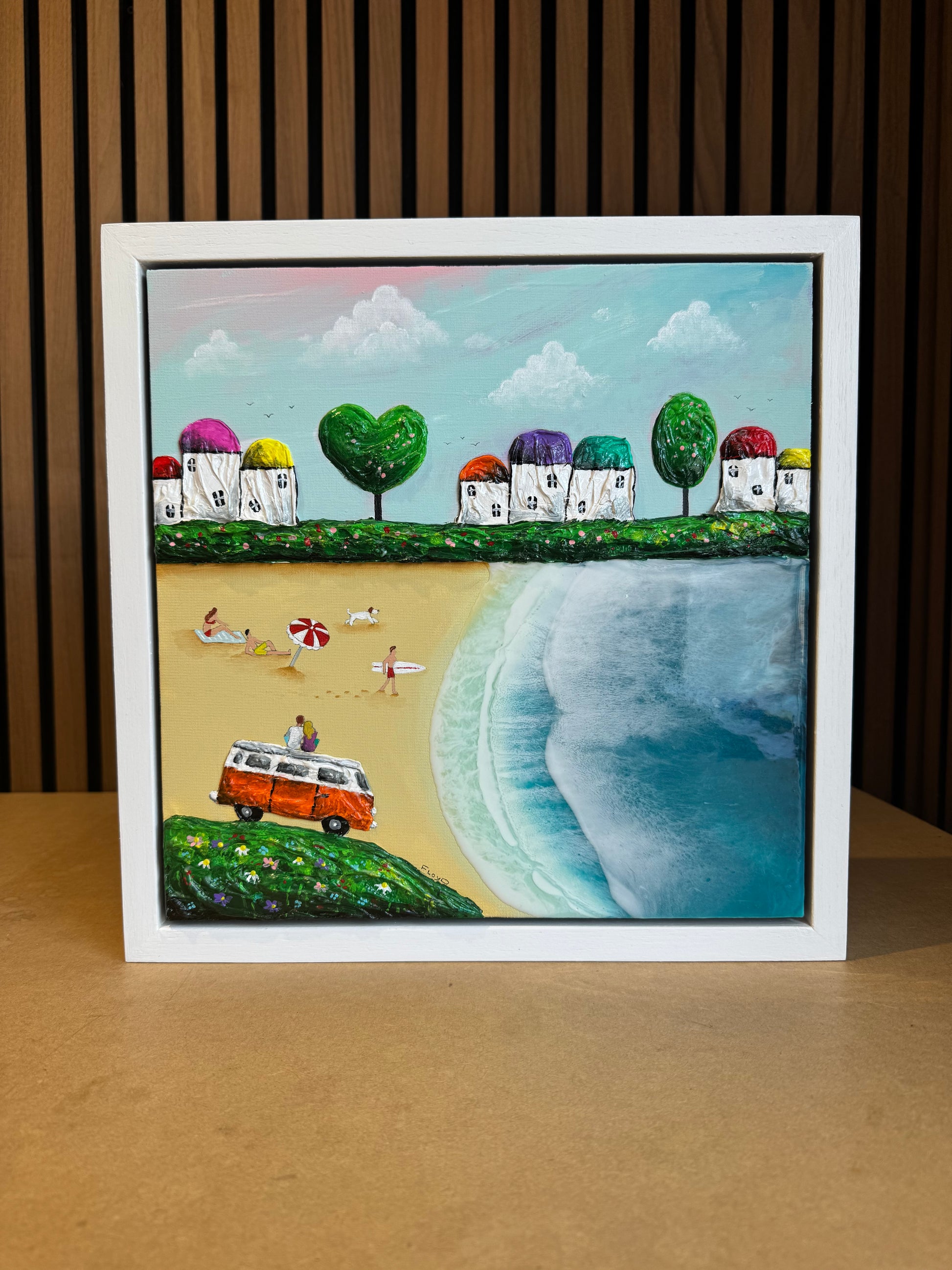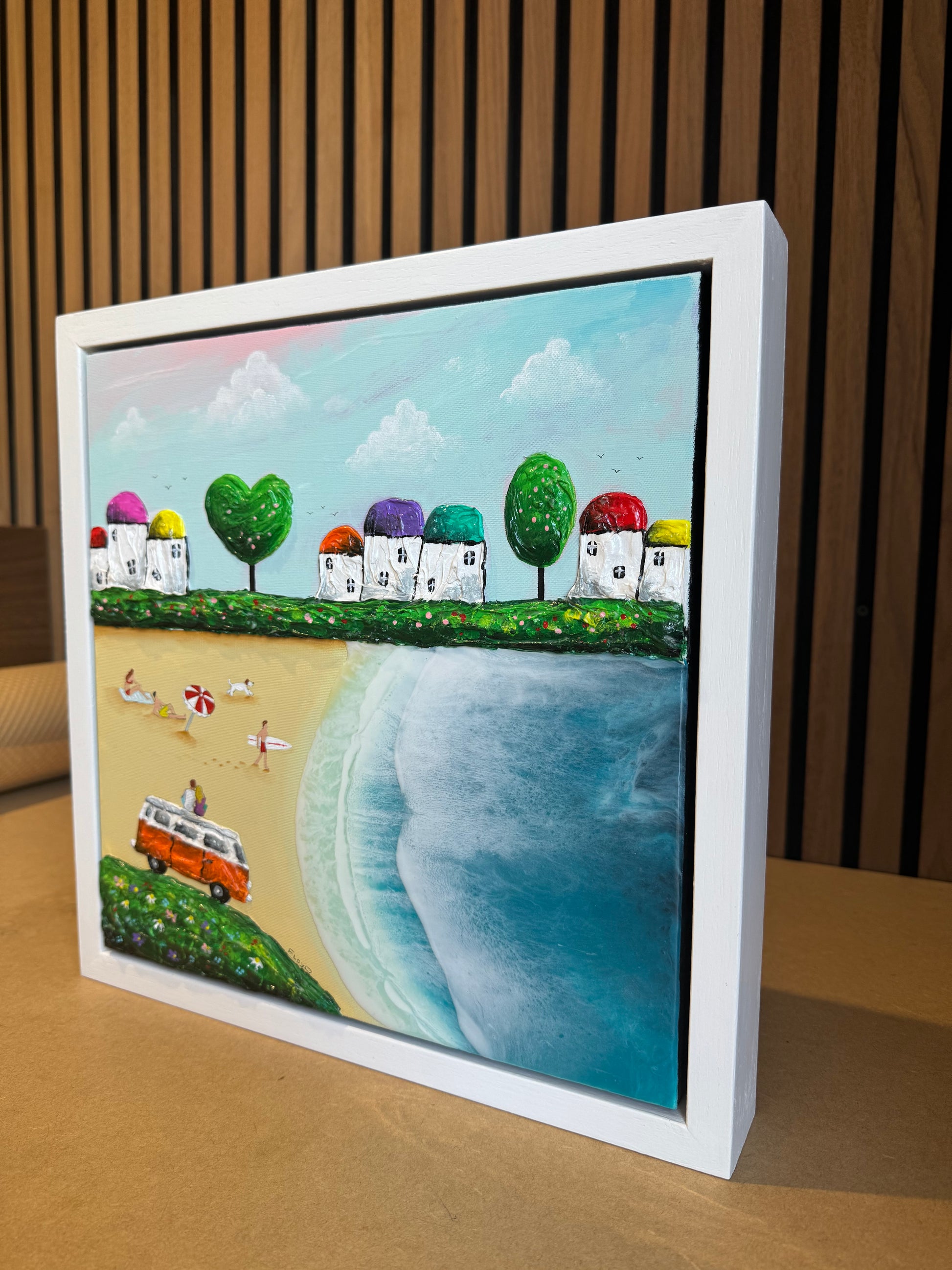 As a 3D artist with over a decade of experience working with resin, I have encountered numerous resin wave creations. However, I did not want to merely represent my surroundings and cherished childhood memories of beach holidays through waves alone. I recognized that the sea had to be a significant aspect of my work, but I also sought to incorporate beach life and the charm of quirky coastal towns. The rugged hills, unique cottages, lighthouses, and even camper vans are all hand-sculpted directly onto the canvas, rendering each painting completely unique. They even cast their own shadows, enhancing their lifelike quality in a manner that sets them apart from others.