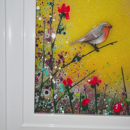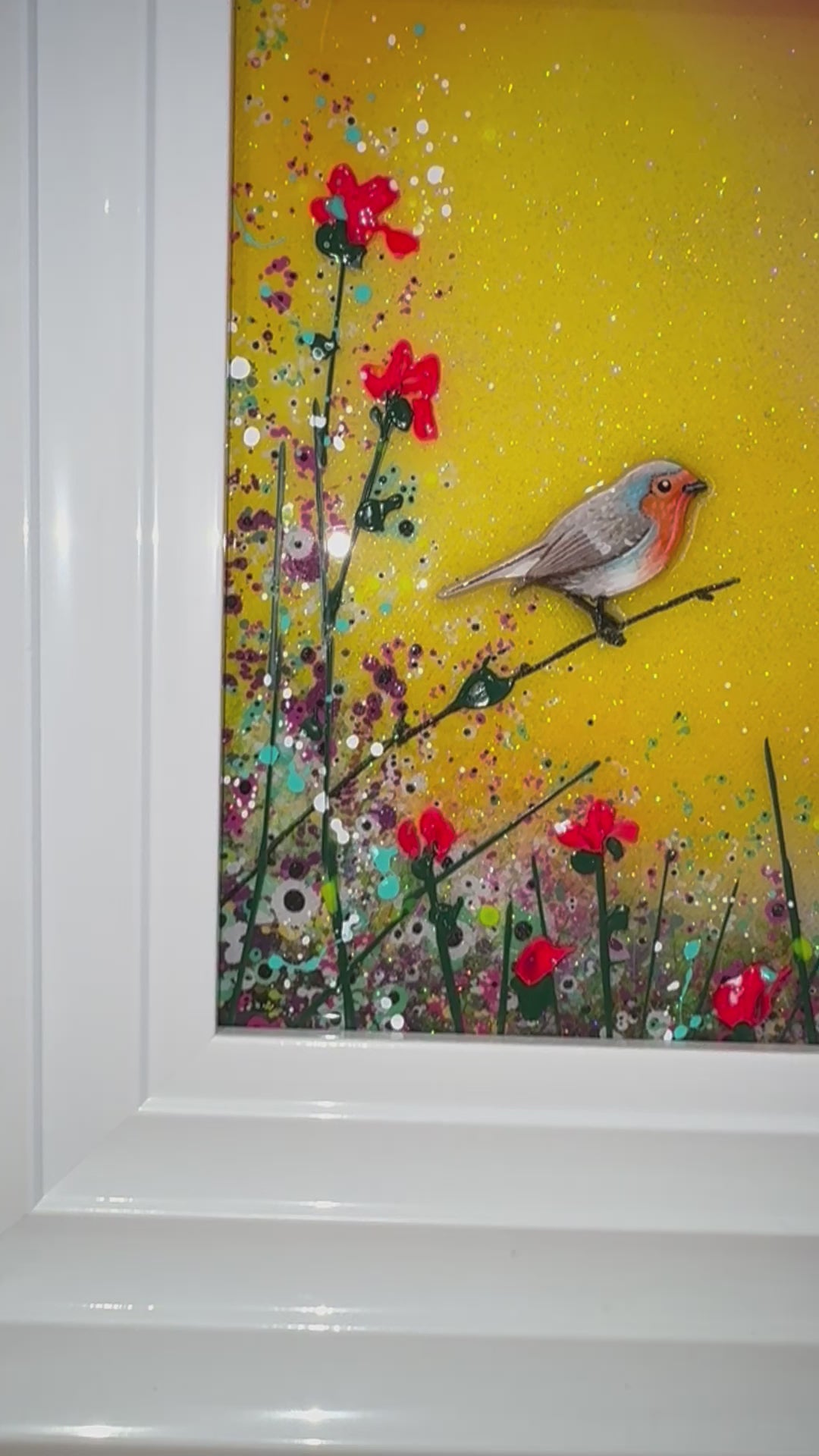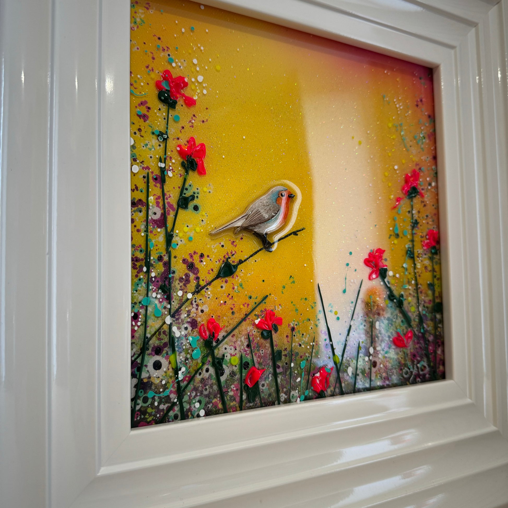 resin mixed media on board with 3D hand painted and cut Robin element.