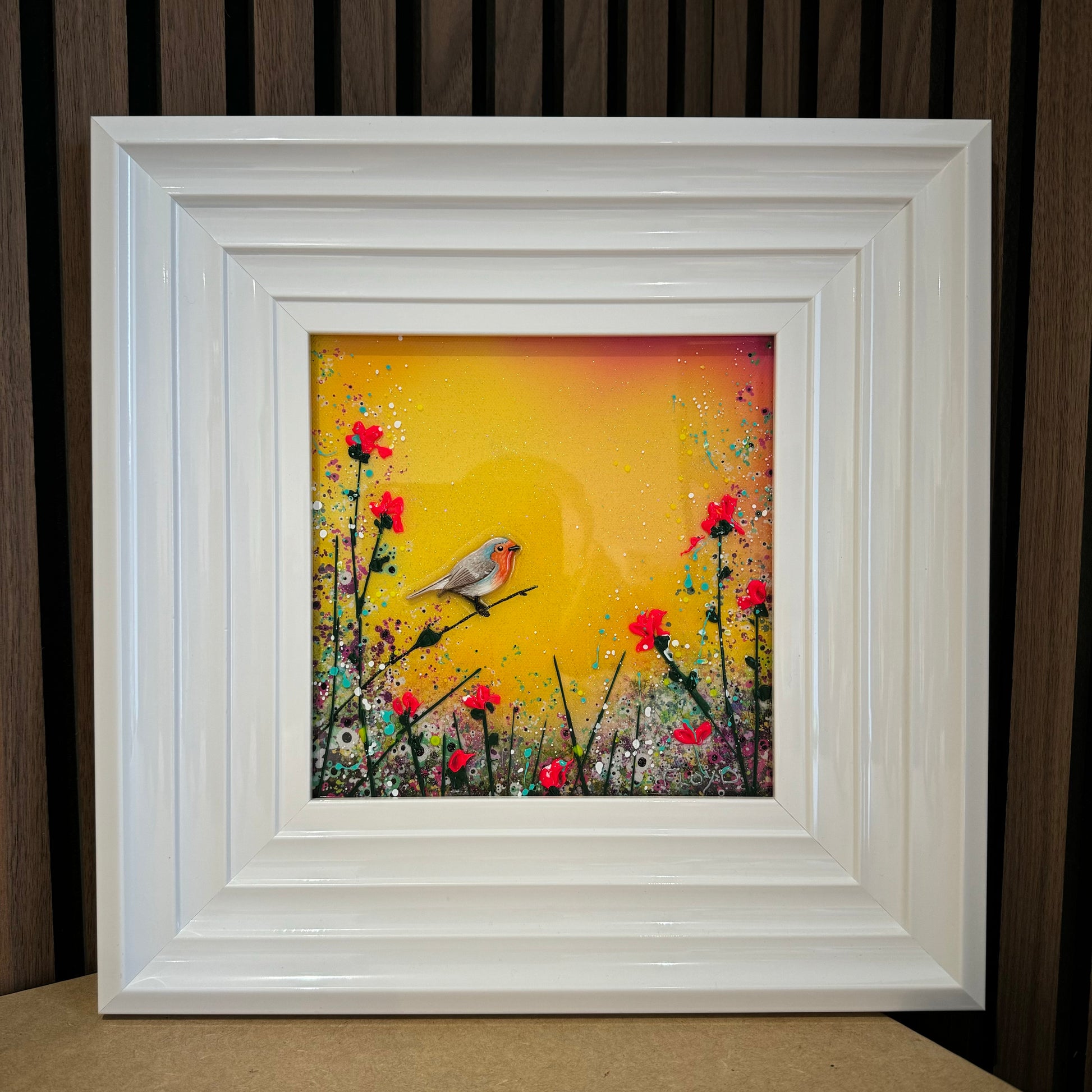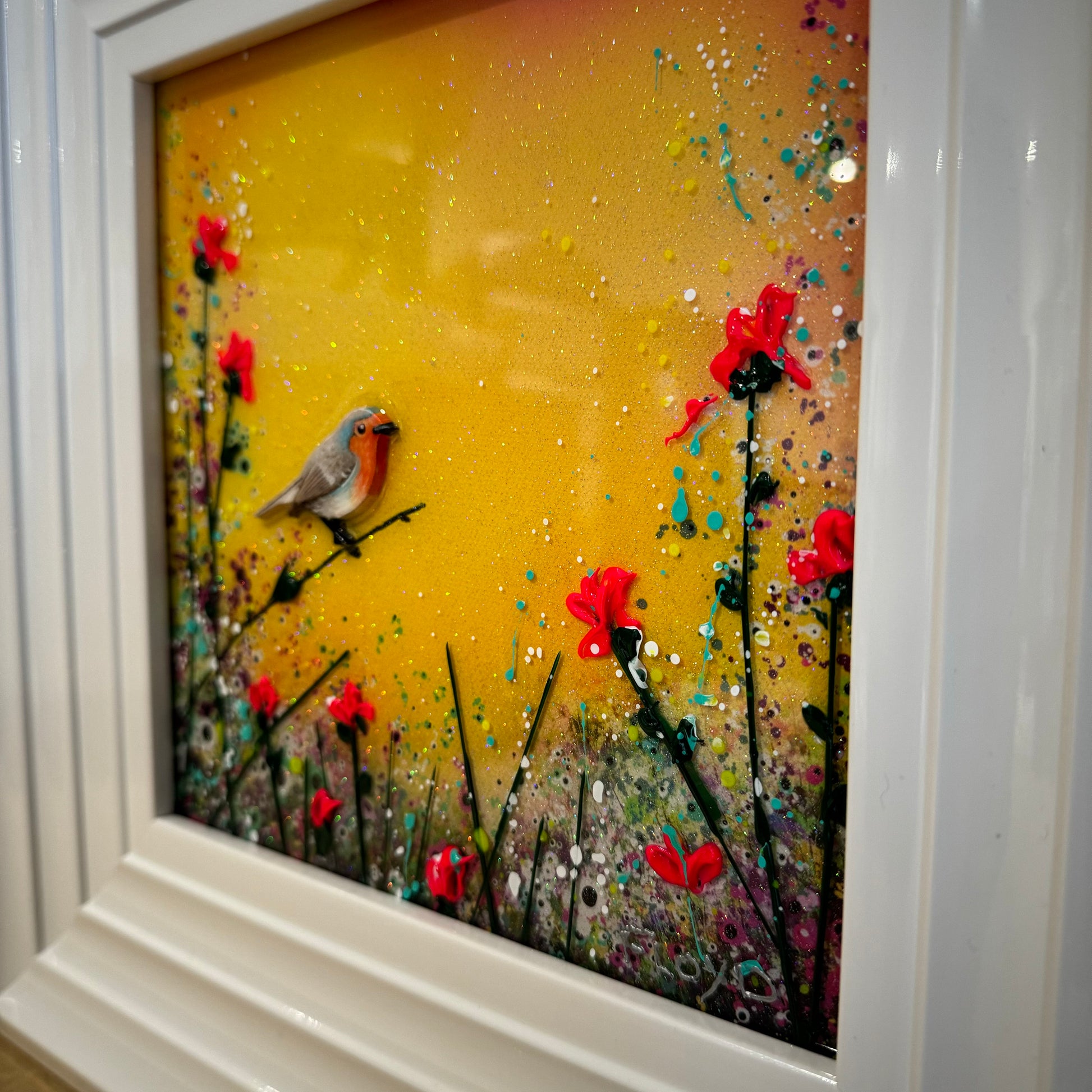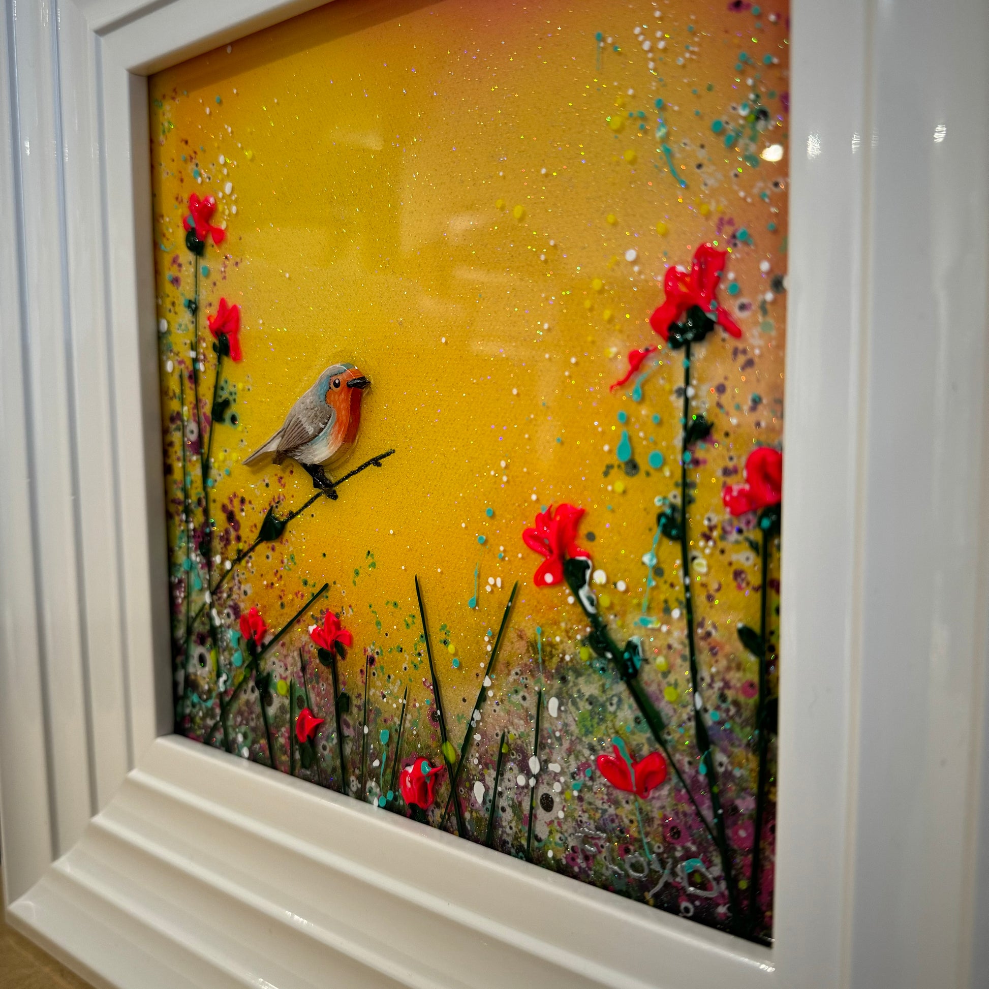 resin mixed media on board with 3D hand painted and cut Robin element.
