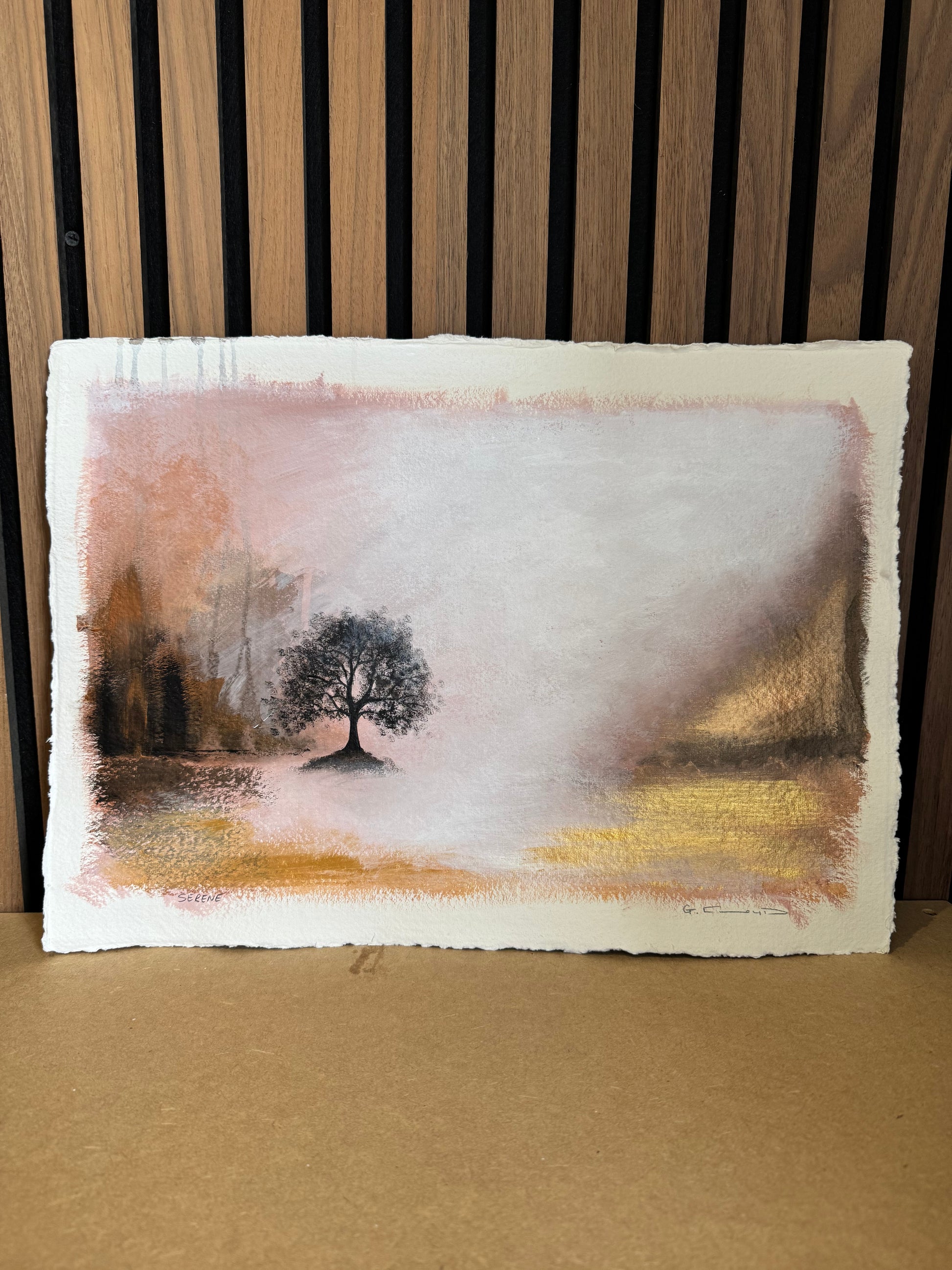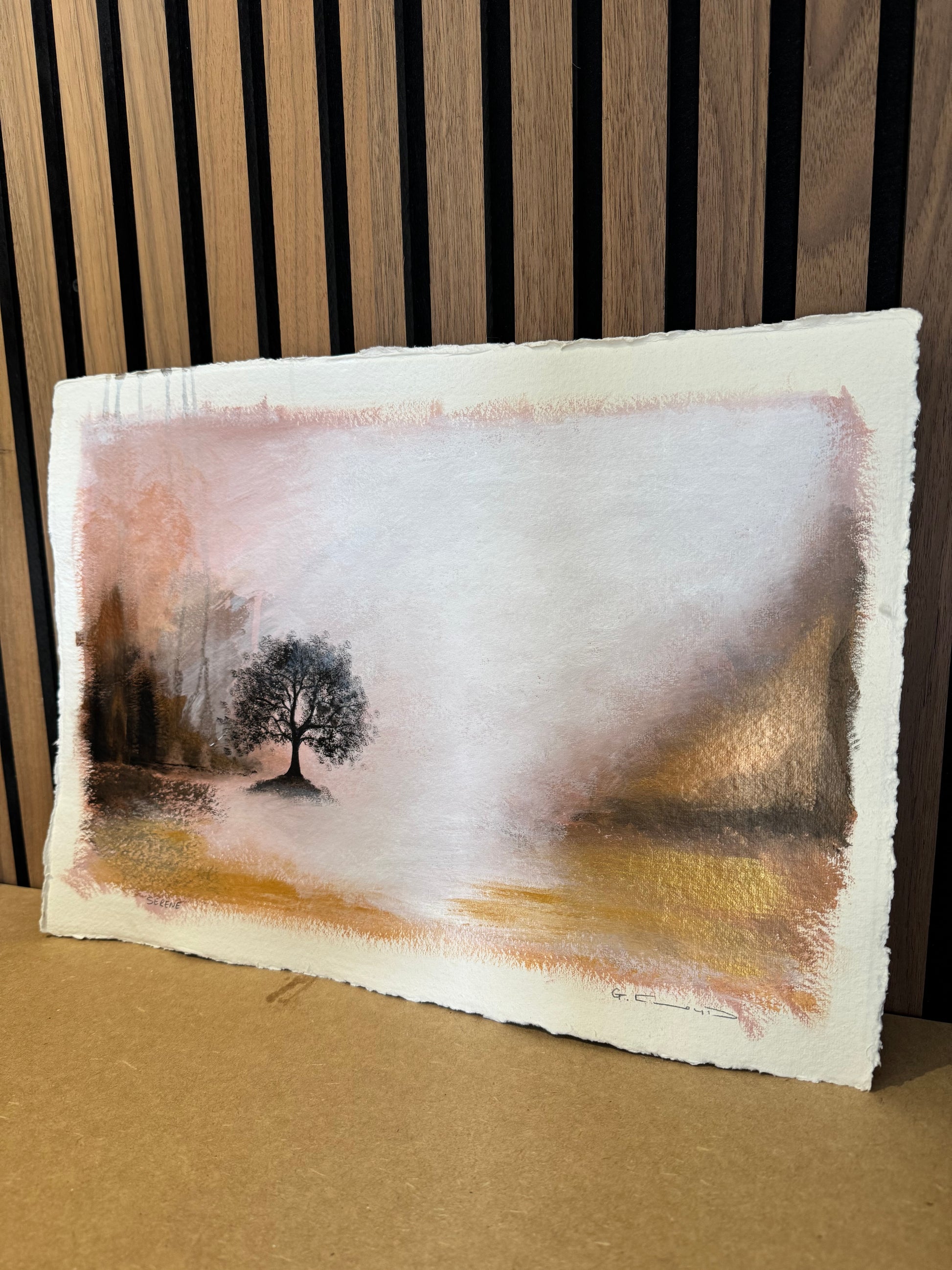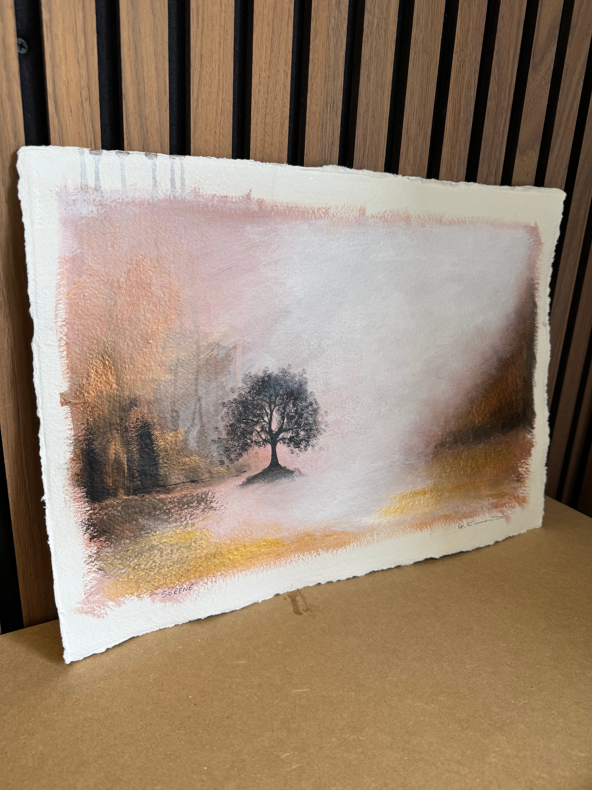 This original mixed media artwork combines a rich palette of acrylics and inks applied on 640gsm handmade paper. This piece serves as a contemplative study of stillness and solitude in nature, exploring the profound impact of light and its interaction with the surrounding space. It invites viewers to engage their imaginations, creating a serene atmosphere that encourages introspection and reflection on the tranquility found within the natural world.