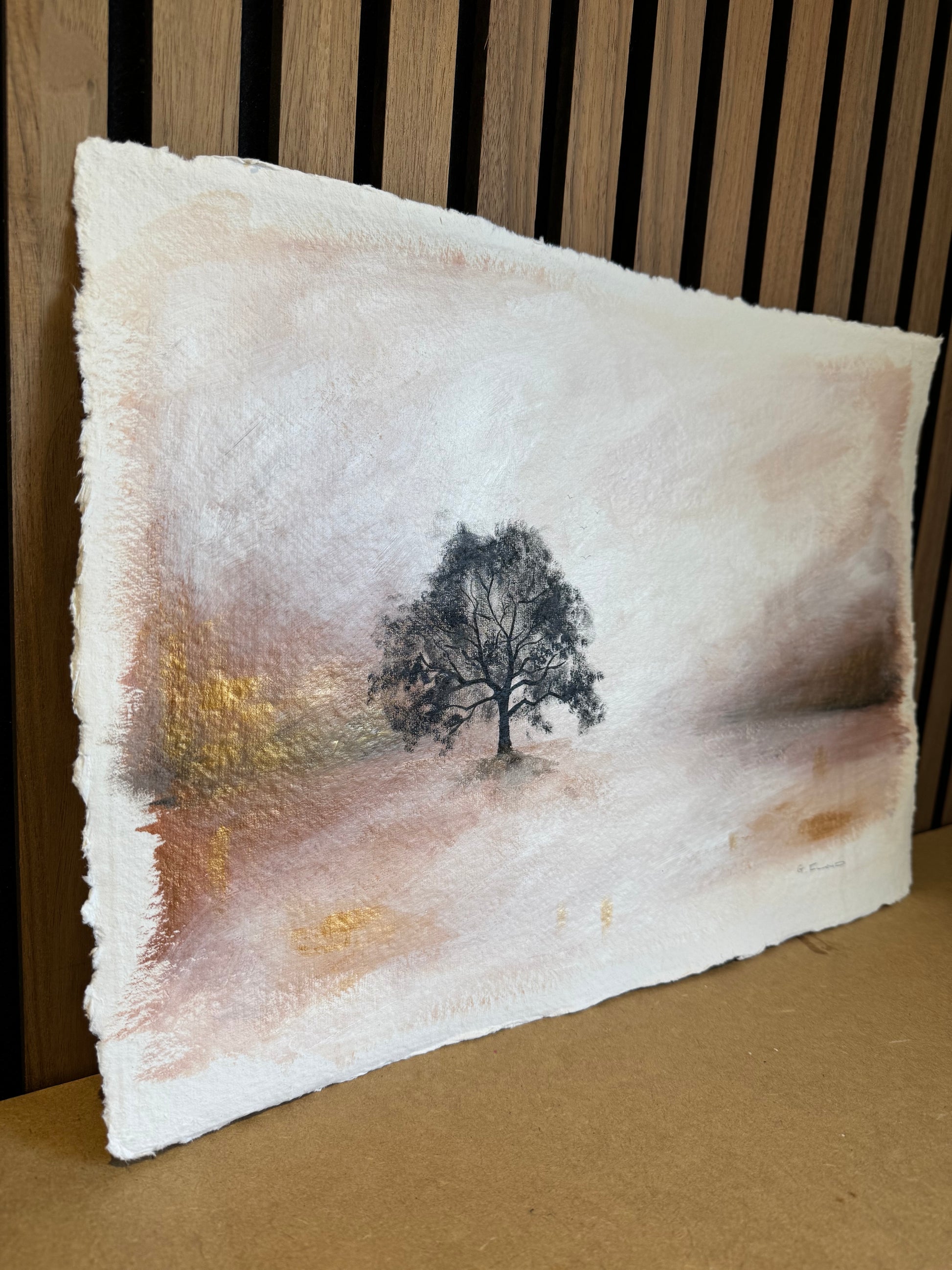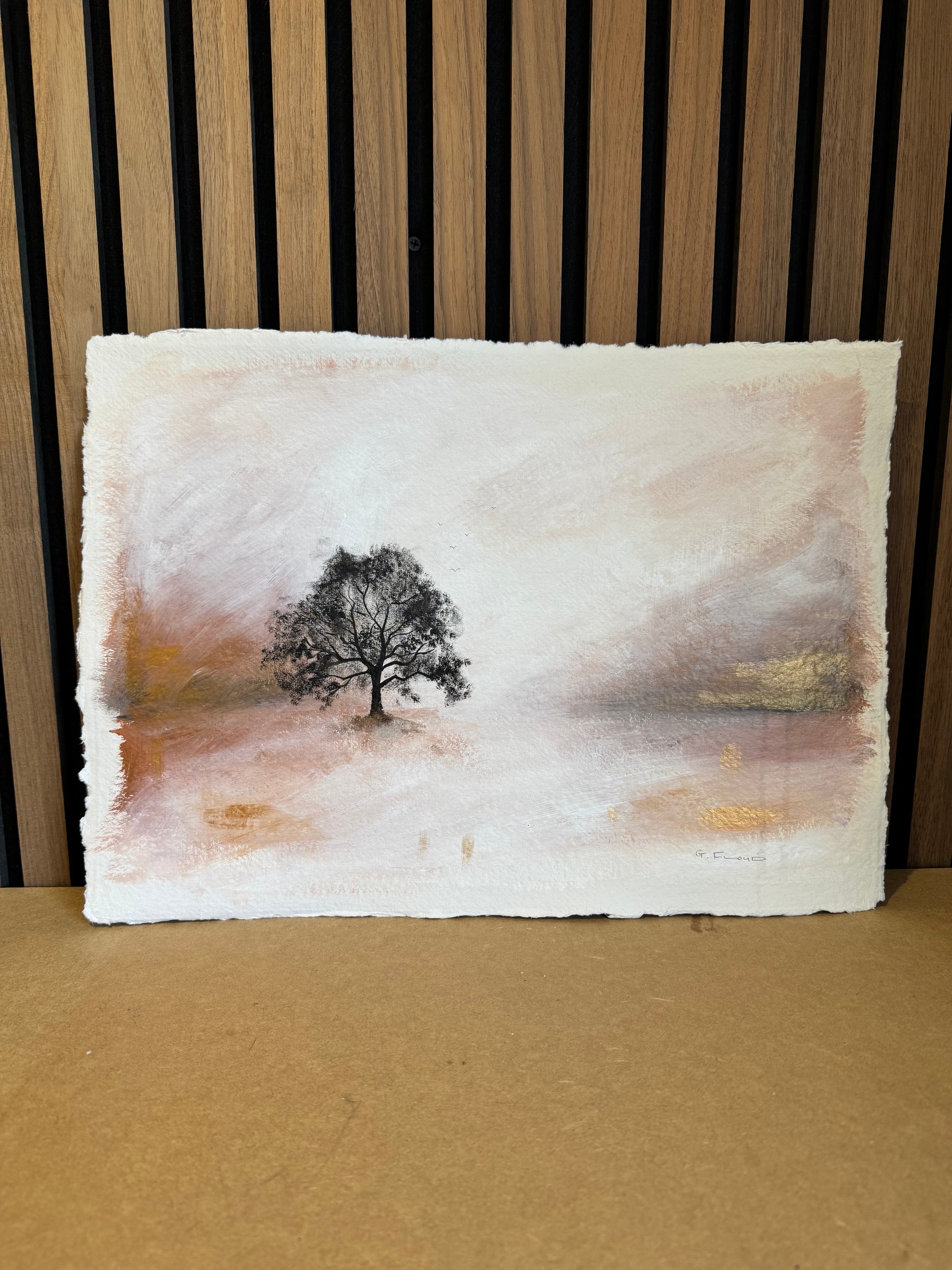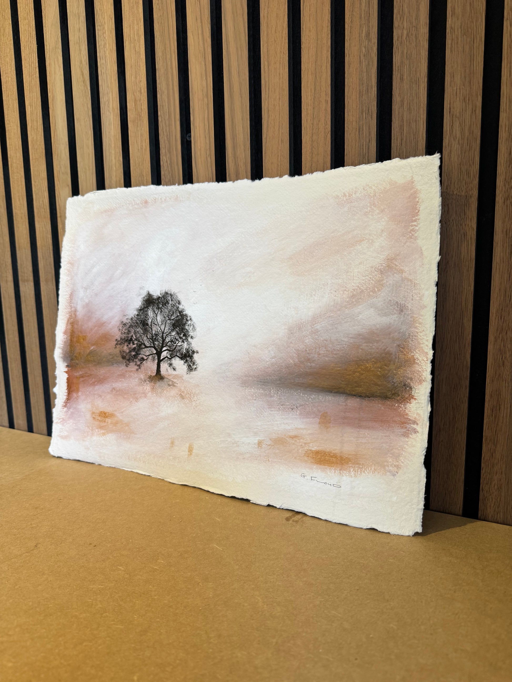 This original mixed media artwork combines a rich palette of acrylics and inks applied on 640gsm handmade paper. This piece serves as a contemplative study of stillness and solitude in nature, exploring the profound impact of light and its interaction with the surrounding space. It invites viewers to engage their imaginations, creating a serene atmosphere that encourages introspection and reflection on the tranquility found within the natural world.