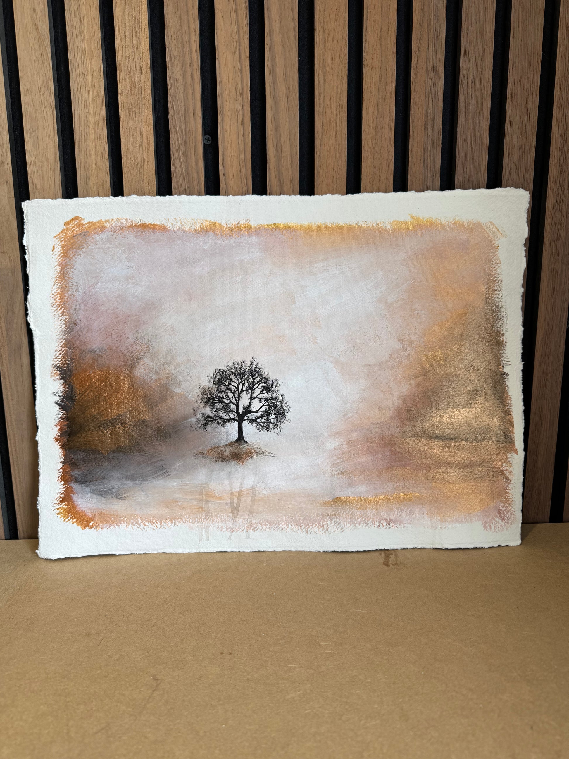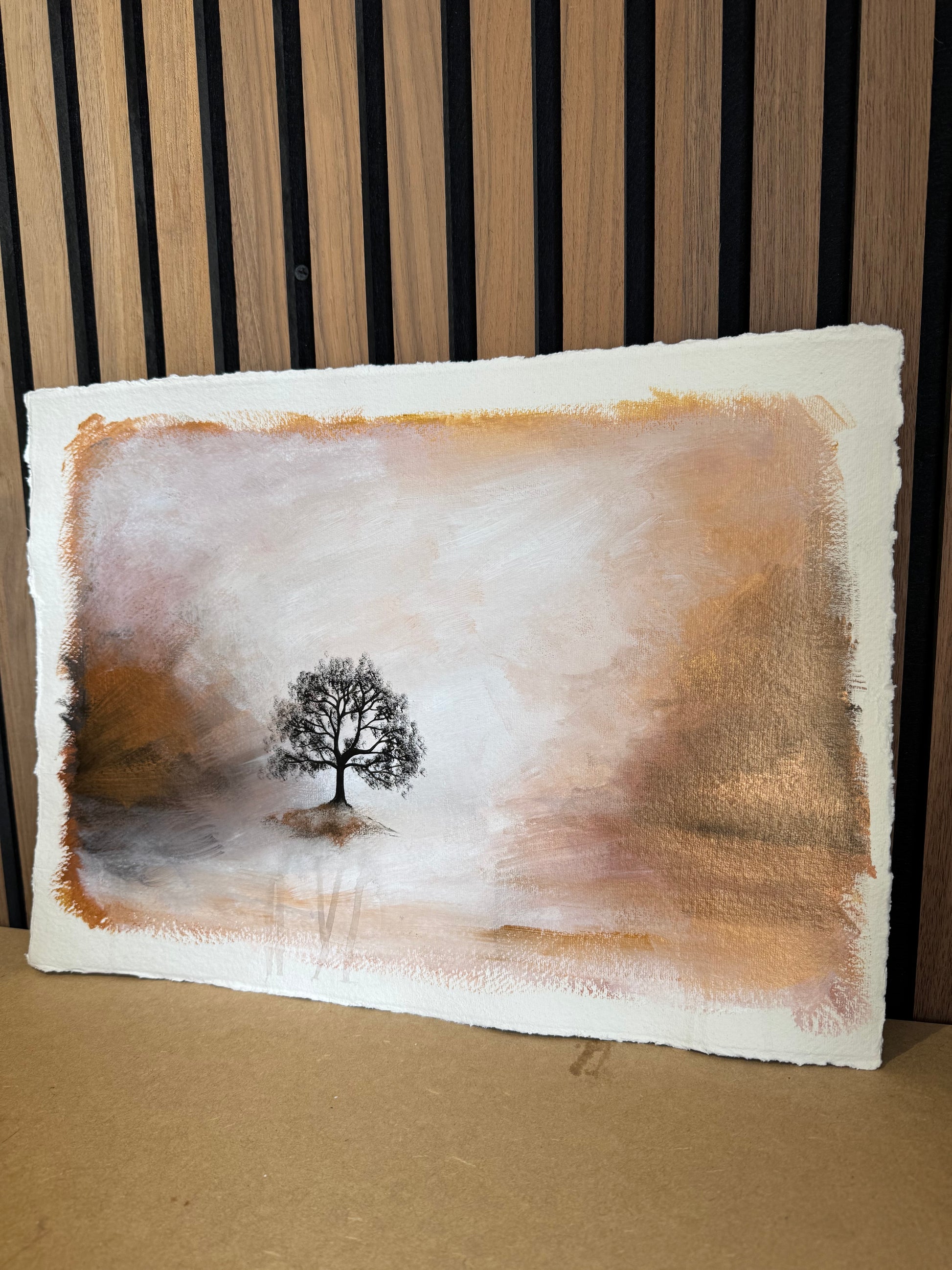 This original mixed media artwork combines a rich palette of acrylics and inks applied on 640gsm handmade paper. This piece serves as a contemplative study of stillness and solitude in nature, exploring the profound impact of light and its interaction with the surrounding space. It invites viewers to engage their imaginations, creating a serene atmosphere that encourages introspection and reflection on the tranquility found within the natural world.