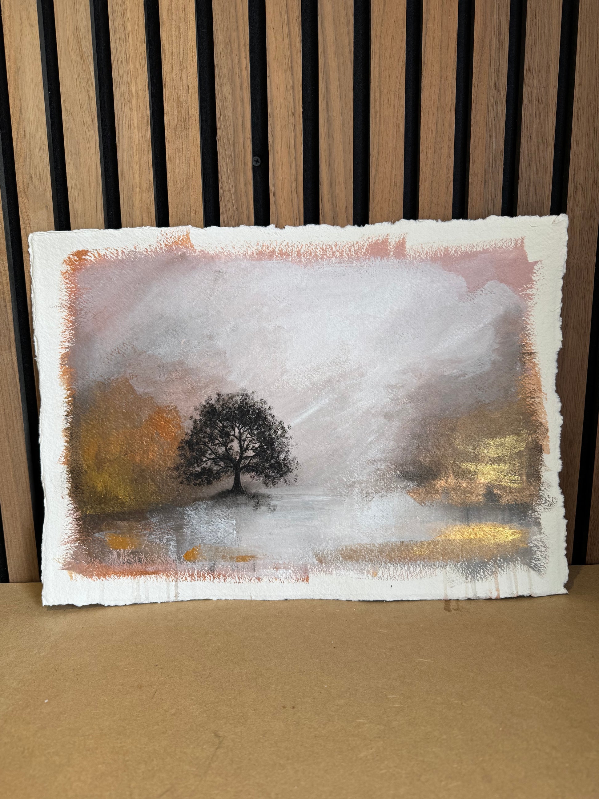 This original mixed media artwork combines a rich palette of acrylics and inks applied on 640gsm handmade paper. This piece serves as a contemplative study of stillness and solitude in nature, exploring the profound impact of light and its interaction with the surrounding space. It invites viewers to engage their imaginations, creating a serene atmosphere that encourages introspection and reflection on the tranquility found within the natural world.