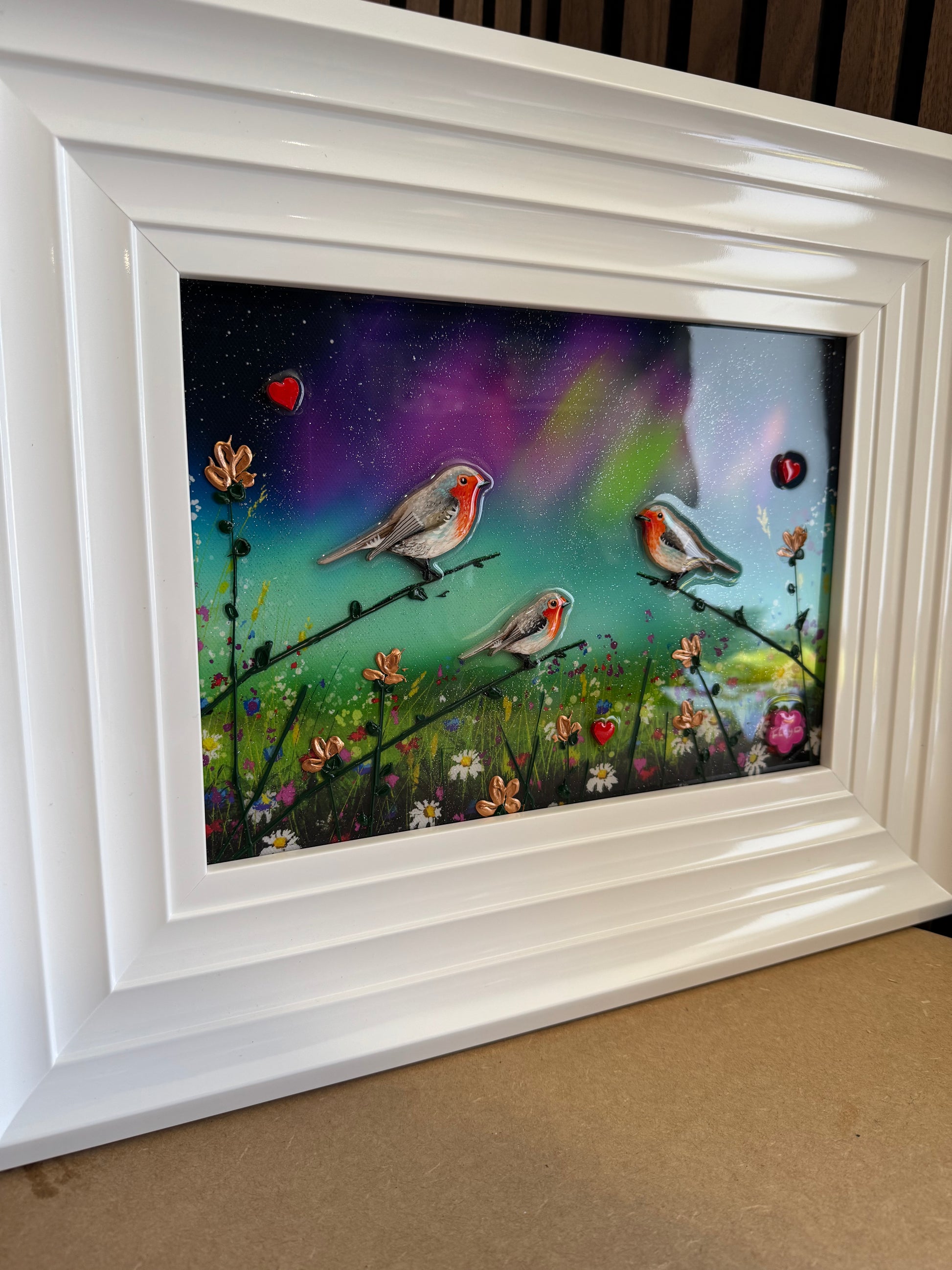 resin mixed media on board with 3D Robin embellishment with each being hand painted
