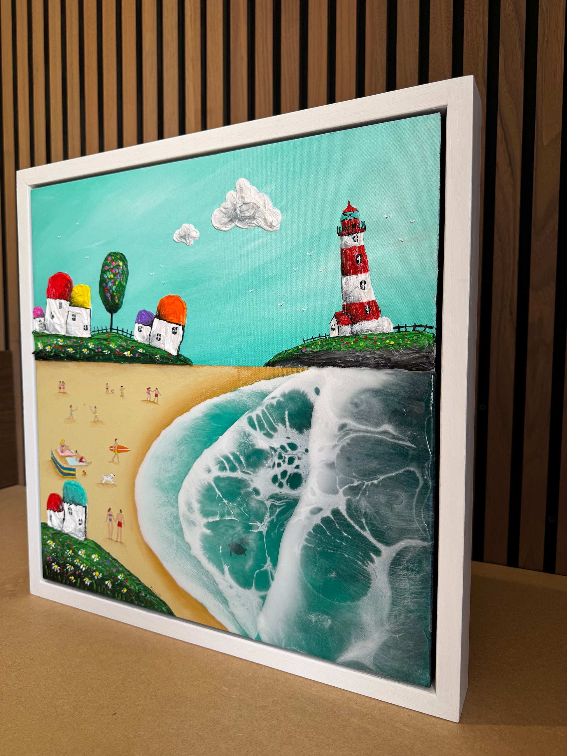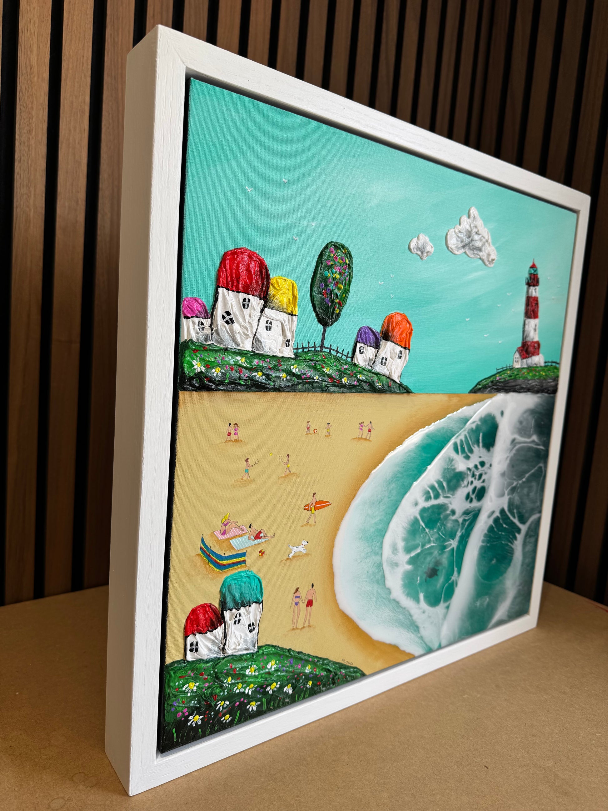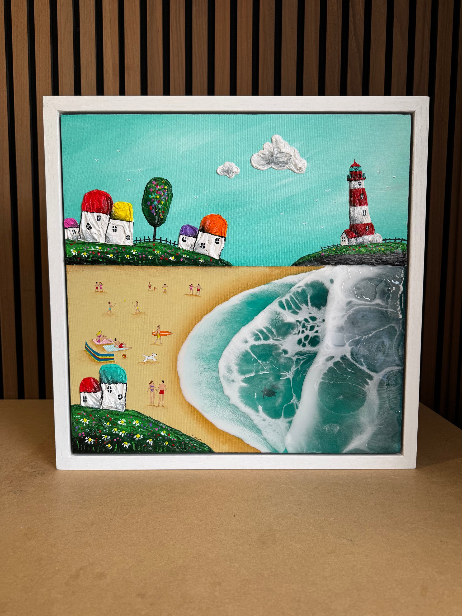 As a 3D artist with over a decade of experience working with resin, I have encountered numerous resin wave creations. However, I did not want to merely represent my surroundings and cherished childhood memories of beach holidays through waves alone. I recognized that the sea had to be a significant aspect of my work, but I also sought to incorporate beach life and the charm of quirky coastal towns. The rugged hills, unique cottages, lighthouses, and even camper vans are all hand-sculpted directly onto the canvas, rendering each painting completely unique. They even cast their own shadows, enhancing their lifelike quality in a manner that sets them apart from others.