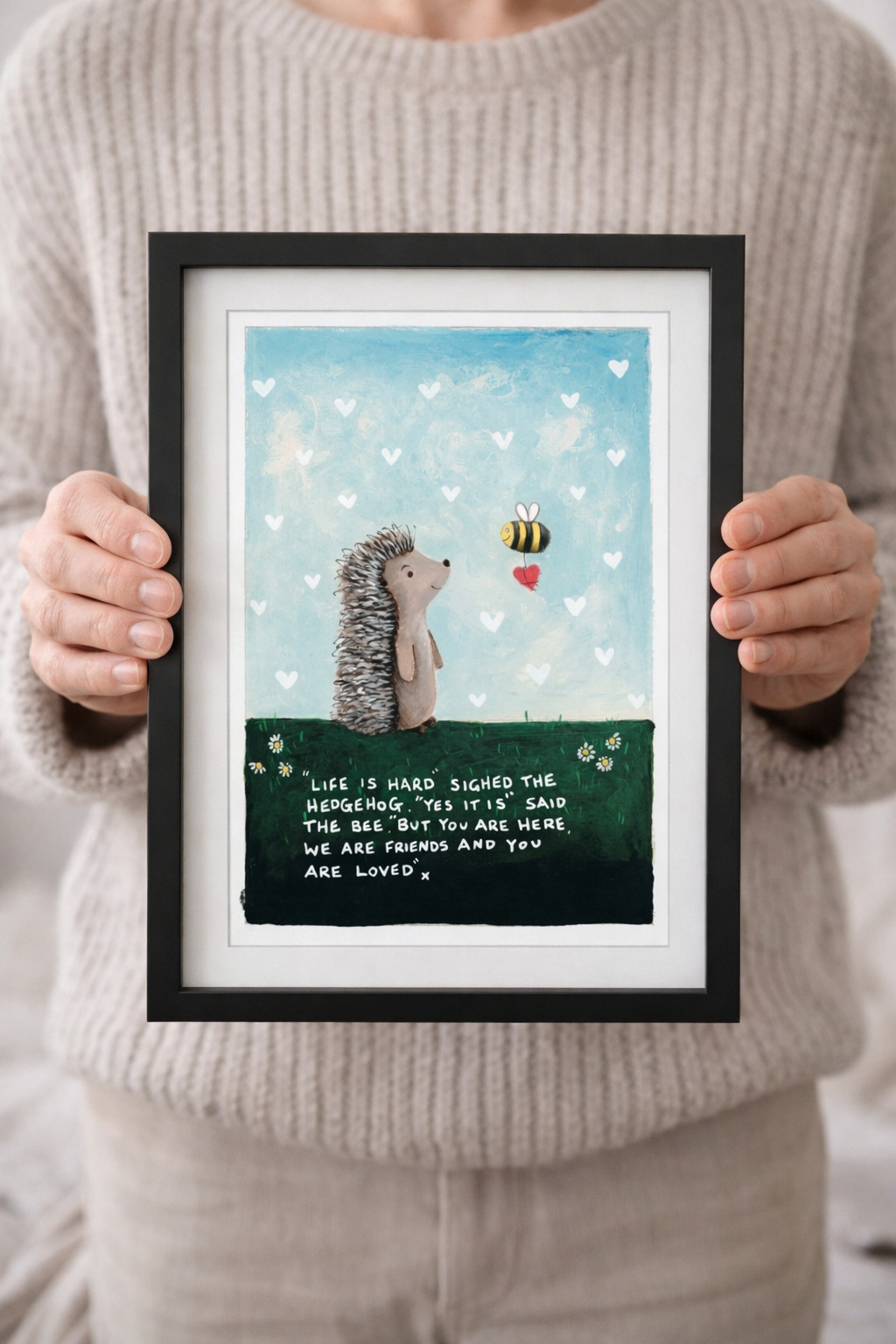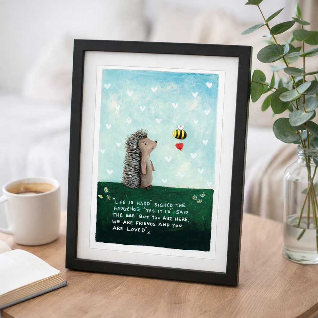With the gentle exchange between the hedgehog and the bee, it captures something simple but powerful—