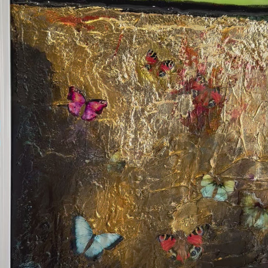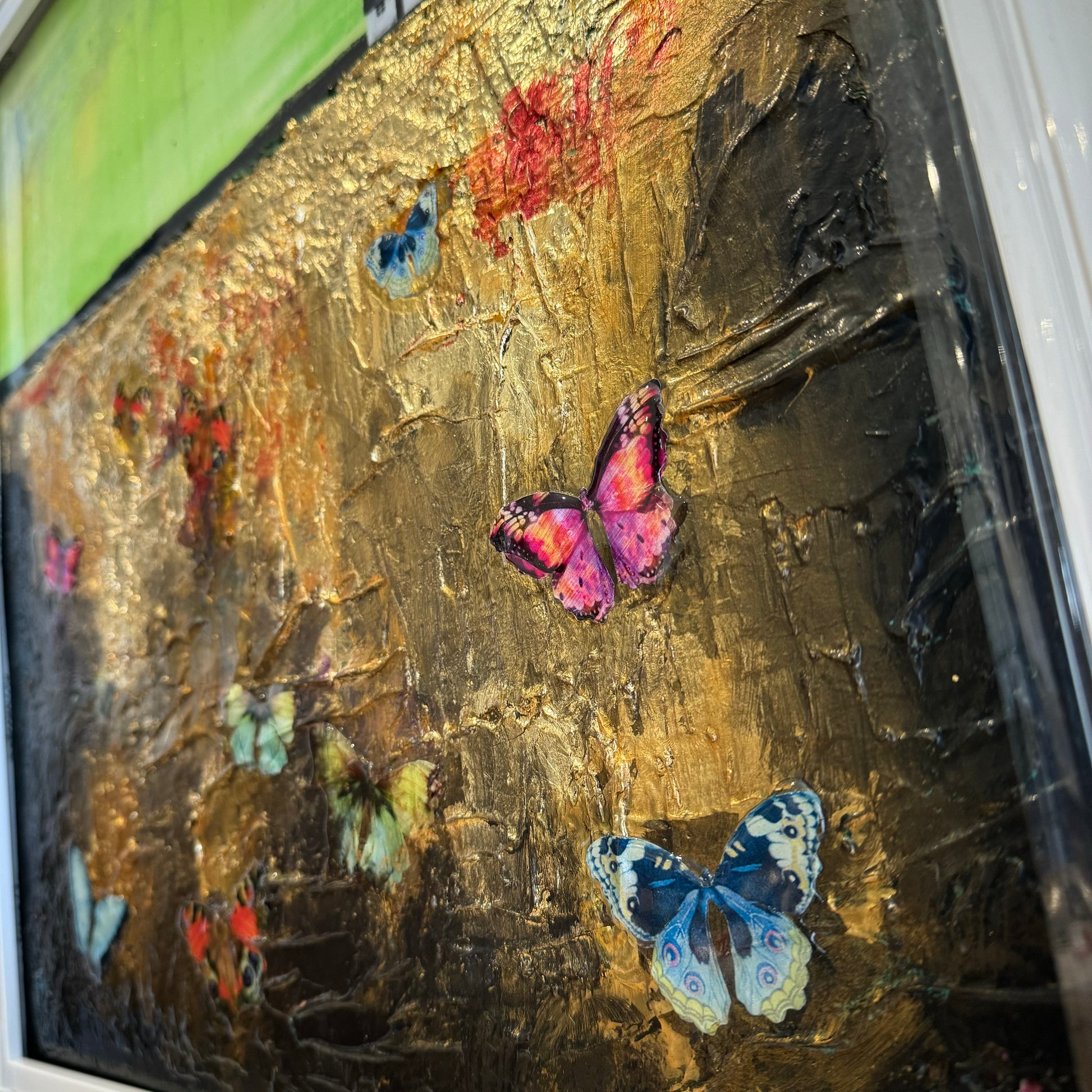 Below, the textured canvas transforms into a rich tapestry of earthy tones, creating a striking contrast with the idyllic scene above. Scattered throughout this structured ground are delicate butterflies, their vibrant colors fluttering like whispers of life amidst the textured landscape. Each butterfly represents a fleeting moment of beauty, echoing the gentle rustle of leaves and the quiet sounds of nature.