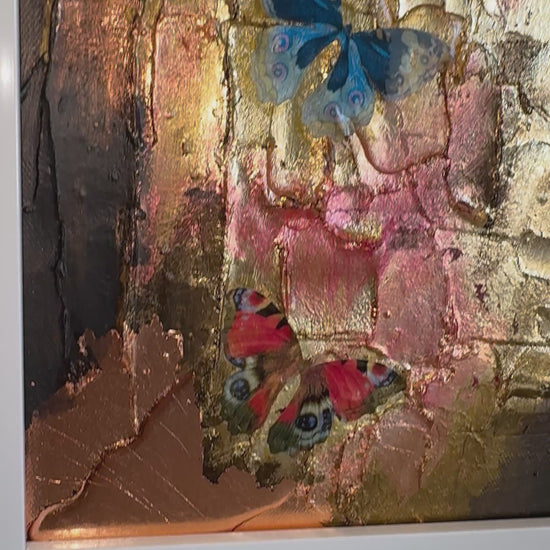Below, the textured canvas transforms into a rich tapestry of earthy tones, creating a striking contrast with the idyllic scene above. Scattered throughout this structured ground are delicate butterflies, their vibrant colors fluttering like whispers of life amidst the textured landscape. Each butterfly represents a fleeting moment of beauty, echoing the gentle rustle of leaves and the quiet sounds of nature.